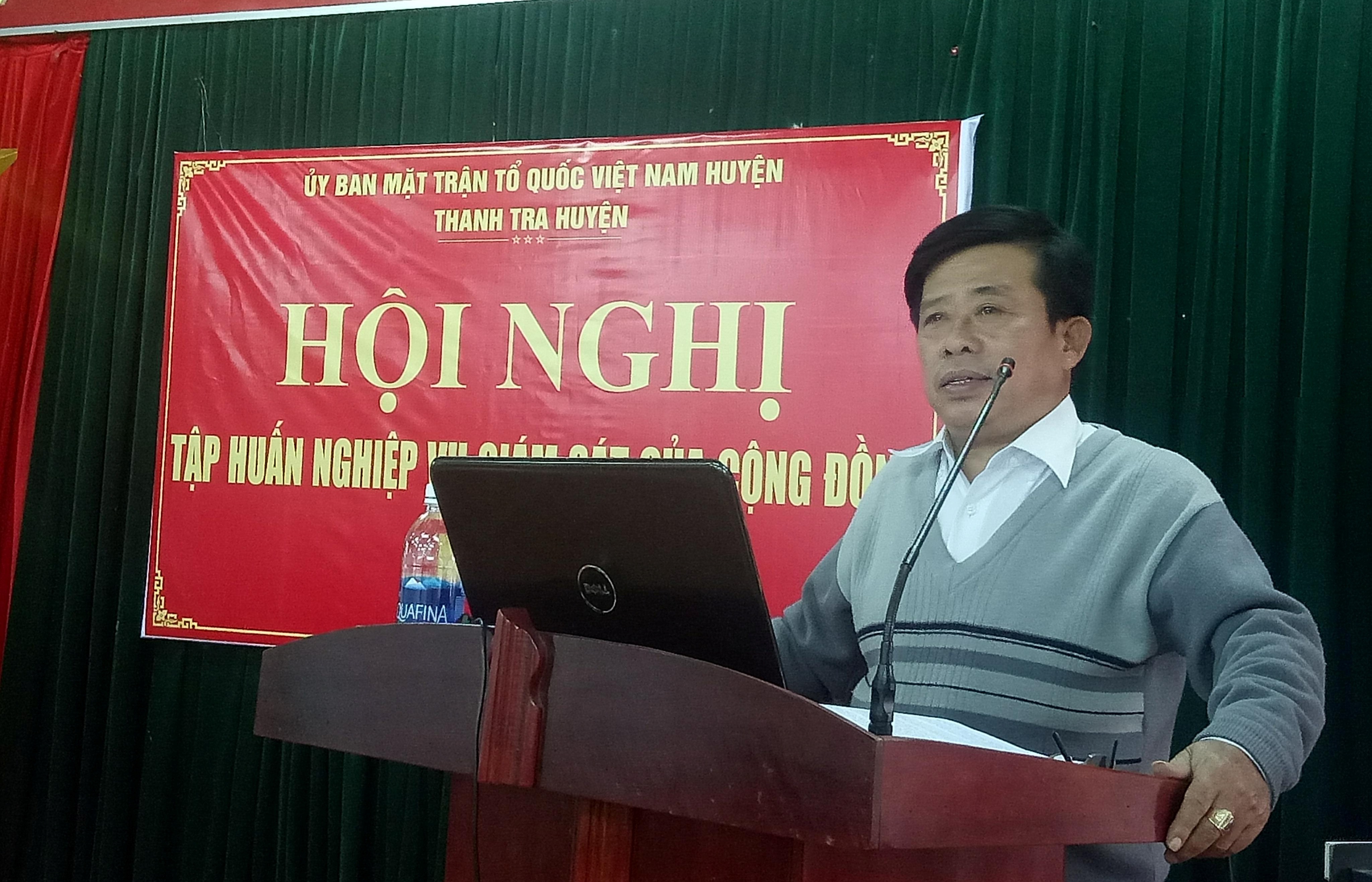 Vừa qua (26.12), Ủy ban MTTQ Việt Nam huyện phối hợp với Thanh tra huyện tổ chức Hội nghị tập huấn nghiệp vụ giám sát của Ban thanh tra nhân dân và giám sát đầu tư cộng đồng cho Ban thanh tran nhân dân; Chủ tịch, Phó chủ tịch Ủy ban MTTQ Việt Nam xã, thị trấn và Trưởng, phó ban Công tác mặt trận các thôn trên địa bàn huyện với 75 người tham gia.