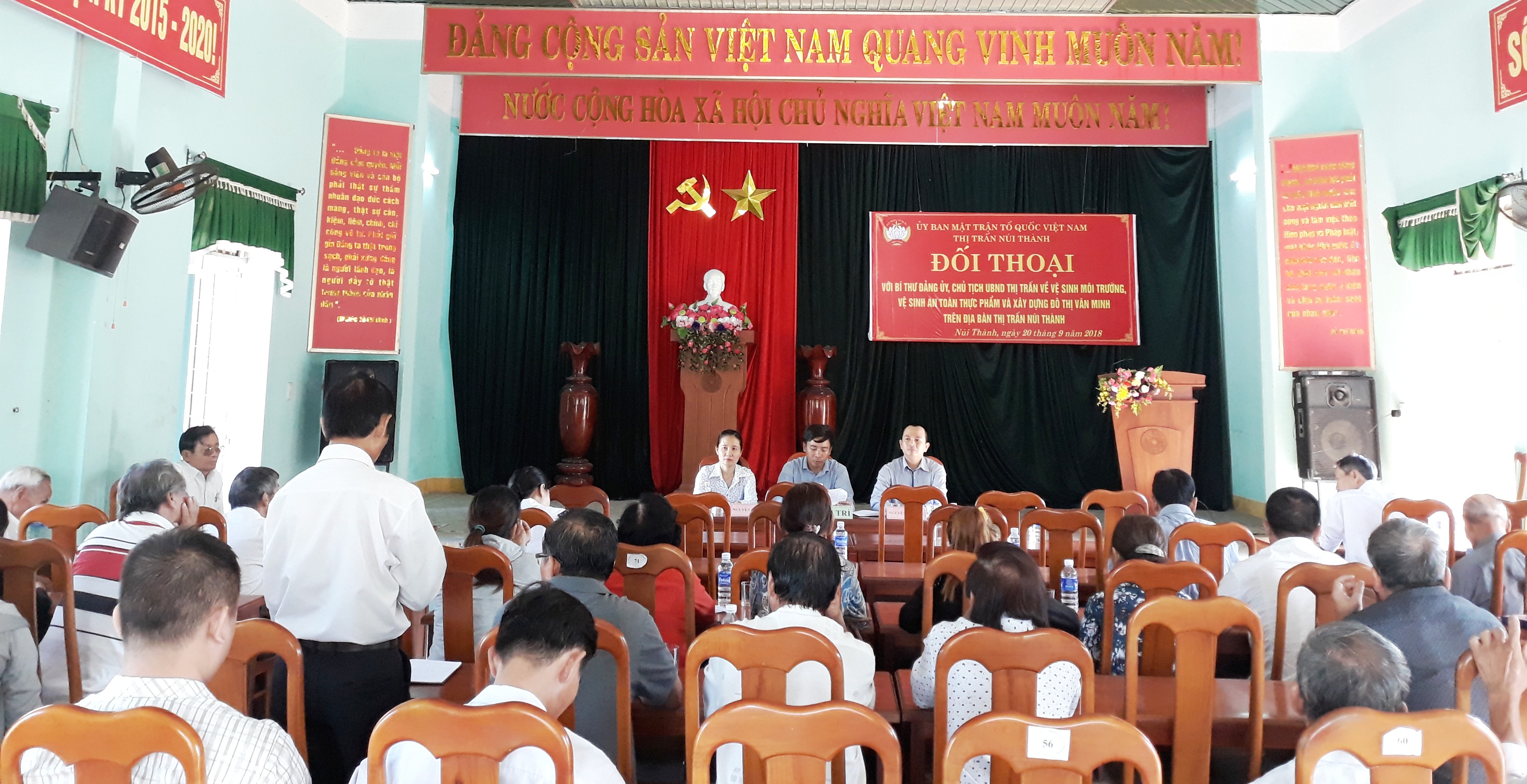 Tại buổi đối thoại, bà Nguyễn Thị Yến - Chủ tịch Ủy ban MTTQ Việt Nam thị trấn nêu lên mục đích của buổi đối thoại nhằm lắng nghe tâm tư, nguyện vọng và ý kiến của Nhân dân; tiếp thu các ý kiến đóng góp, phản ánh của Nhân dân; kịp thời phát hiện những vấn đề còn vướng mắc phát sinh điều chỉnh những chủ trương, chính sách, quy định chưa phù hợp; những thuận lợi khó khăn trong lãnh đạo, chỉ đạo, quản lý, điều hành; góp phần củng cố, tăng cường sự thống nhất tư tưởng chính trị, tạo sự đồng thuận trong nhân dân; kịp thời phát hiện những hạn chế trong lãnh đạo, chỉ đạo và tổ chức thực hiện nhiệm vụ; góp phần củng cố mối quan hệ mật thiết giữa Đảng với nhân dân và phát huy vai trò giám sát, phản biện xã hội của MTTQ và các tổ chức chính trị - xã hội. Qua đối thoại để nhân dân hiến kế trong phát triển kinh tế - xã hội và trong đổi mới phương thức lãnh đạo của cấp ủy Đảng, chính quyền, từ đó tạo đồng thuận trong nhân dân để thực hiện thắng lợi nhiệm vụ xây dựng Đảng, chính quyền trong sạch, vững mạnh, giữ vững an ninh, trật tự an toàn xã hội và mục tiêu phát triển KT - XH trên địa bàn thị trấn Núi Thành.