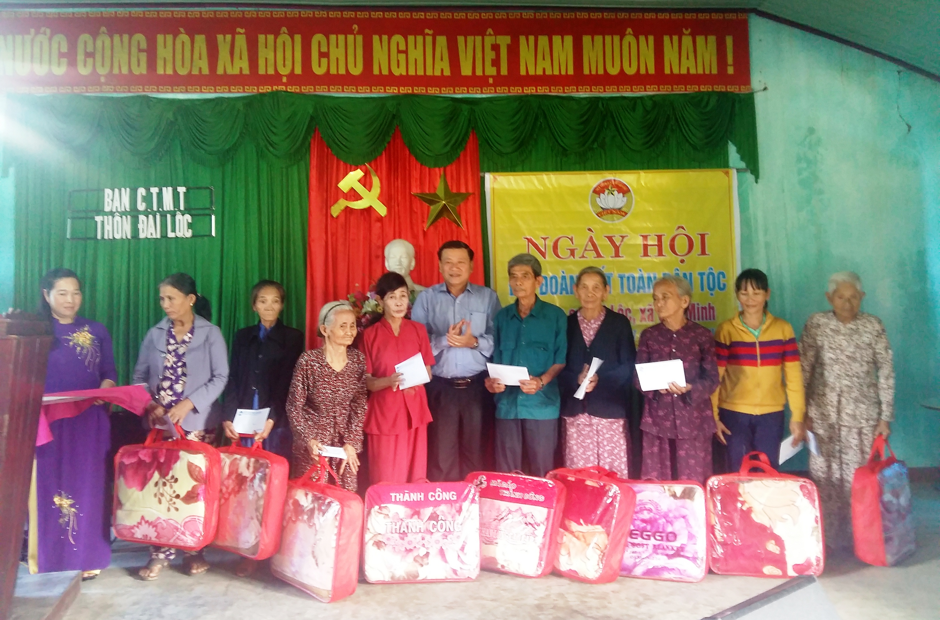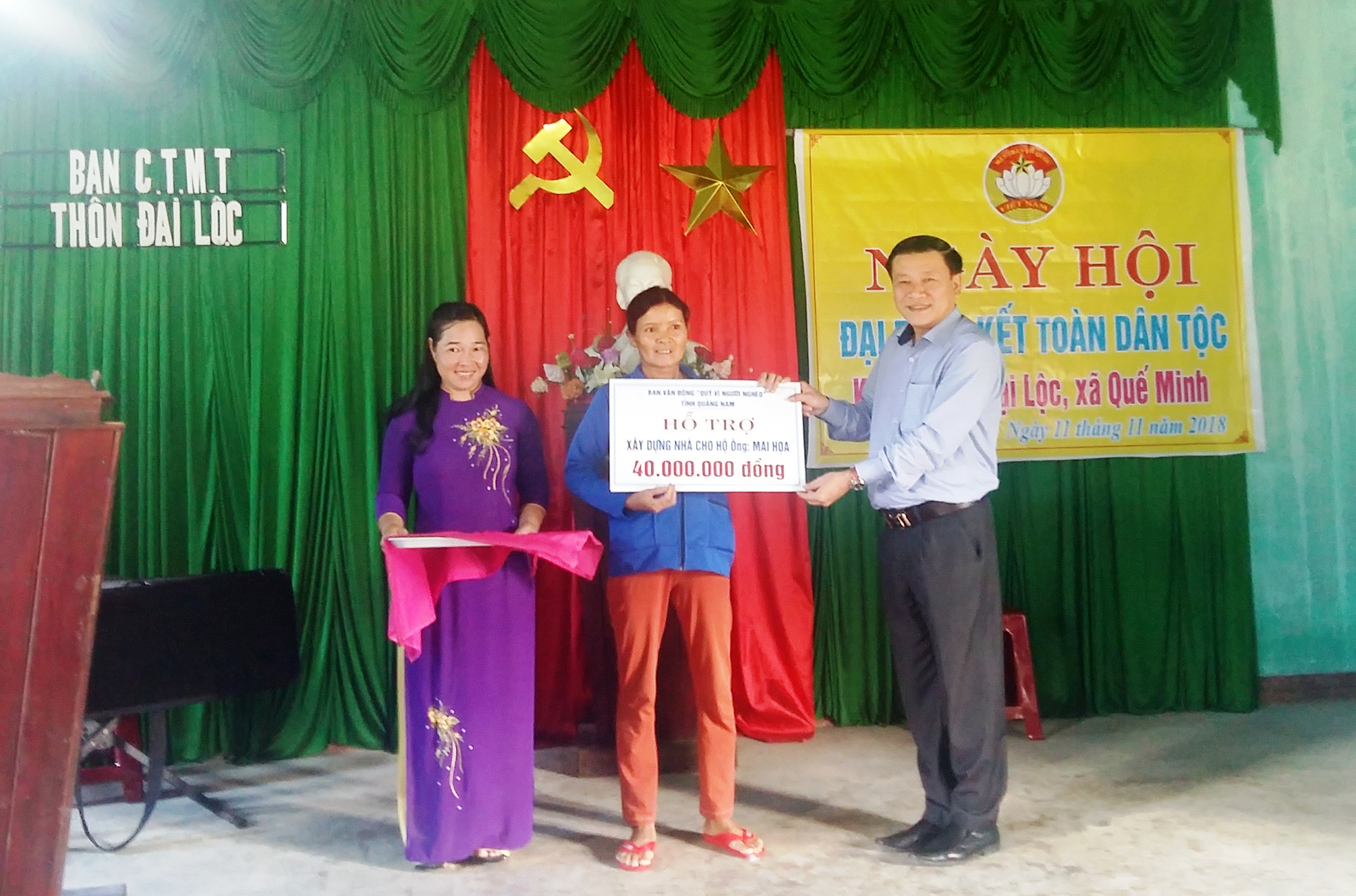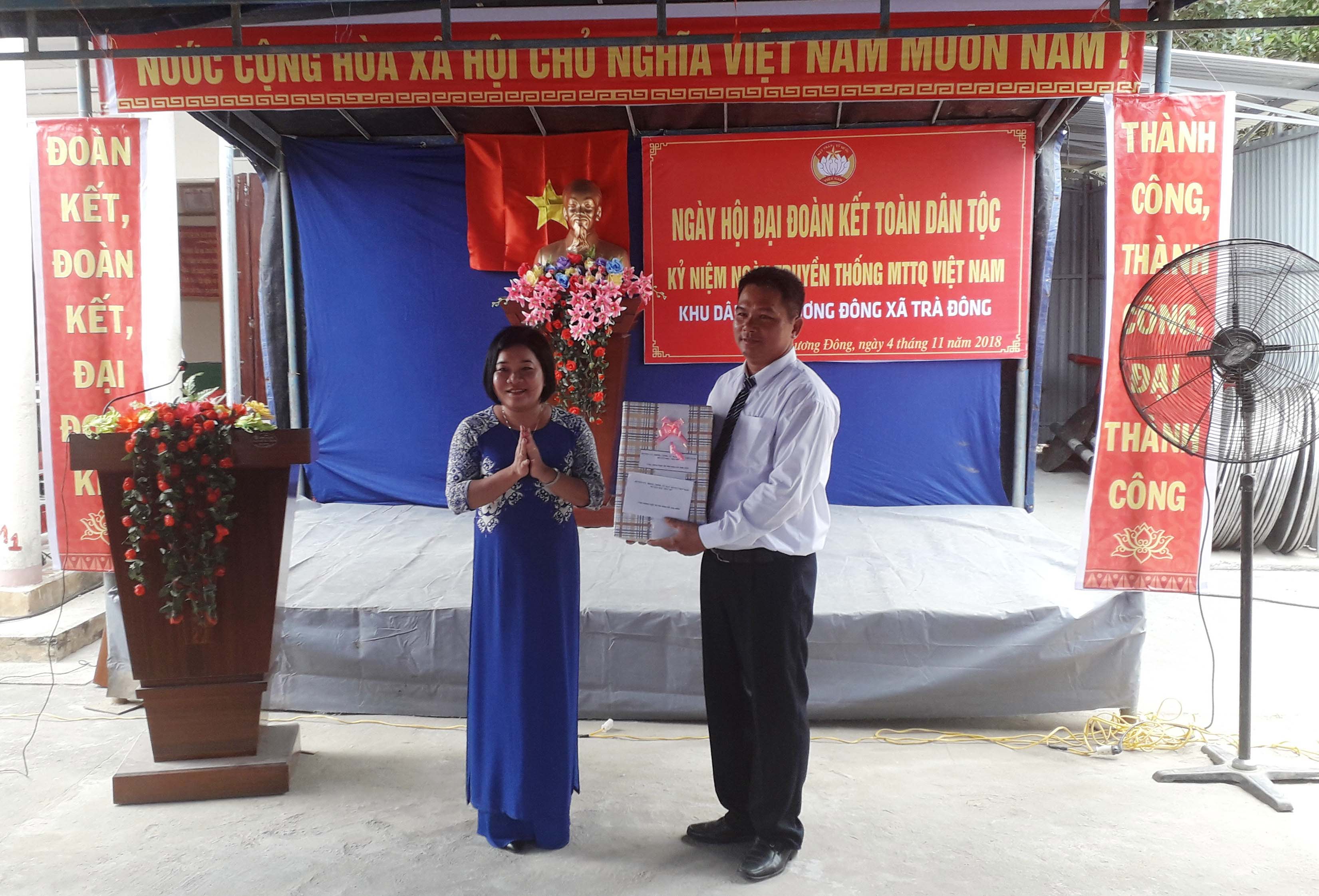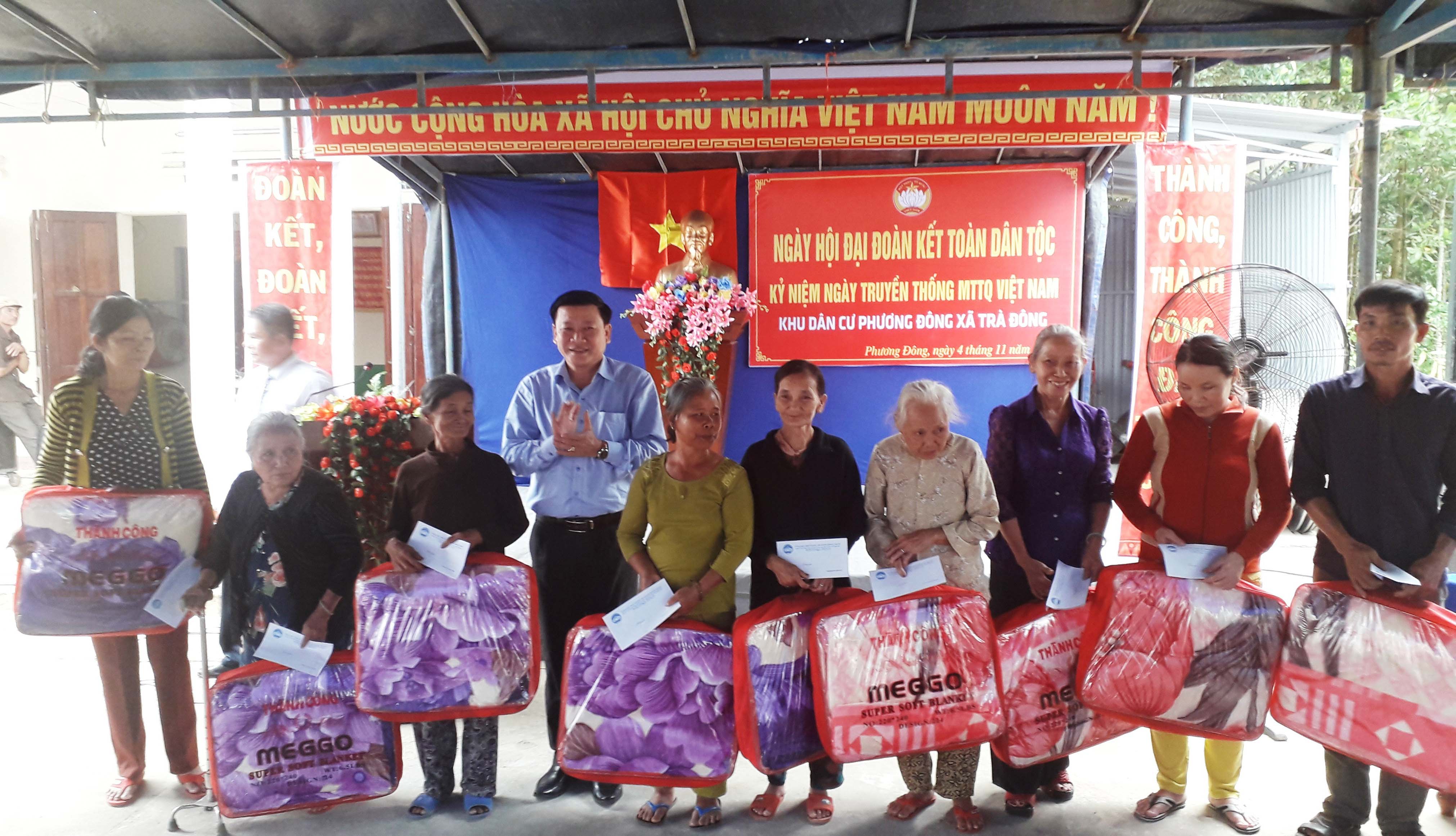 Thay mặt lãnh đạo tỉnh, ông Lê Thái Bình trao bảng tượng 01 ngôi nhà trị giá 40.000.000 đồng và 10 xuất quà, mỗi suất 5 trăm nghìn đồng cho 10 hộ gia đình có hoàn cảnh khó khăn. Lãnh đạo Ủy ban MTTQ Việt Nam huyện cũng tặng hỗ trợ 10 triệu đồng làm nhà cho 01 hộ.