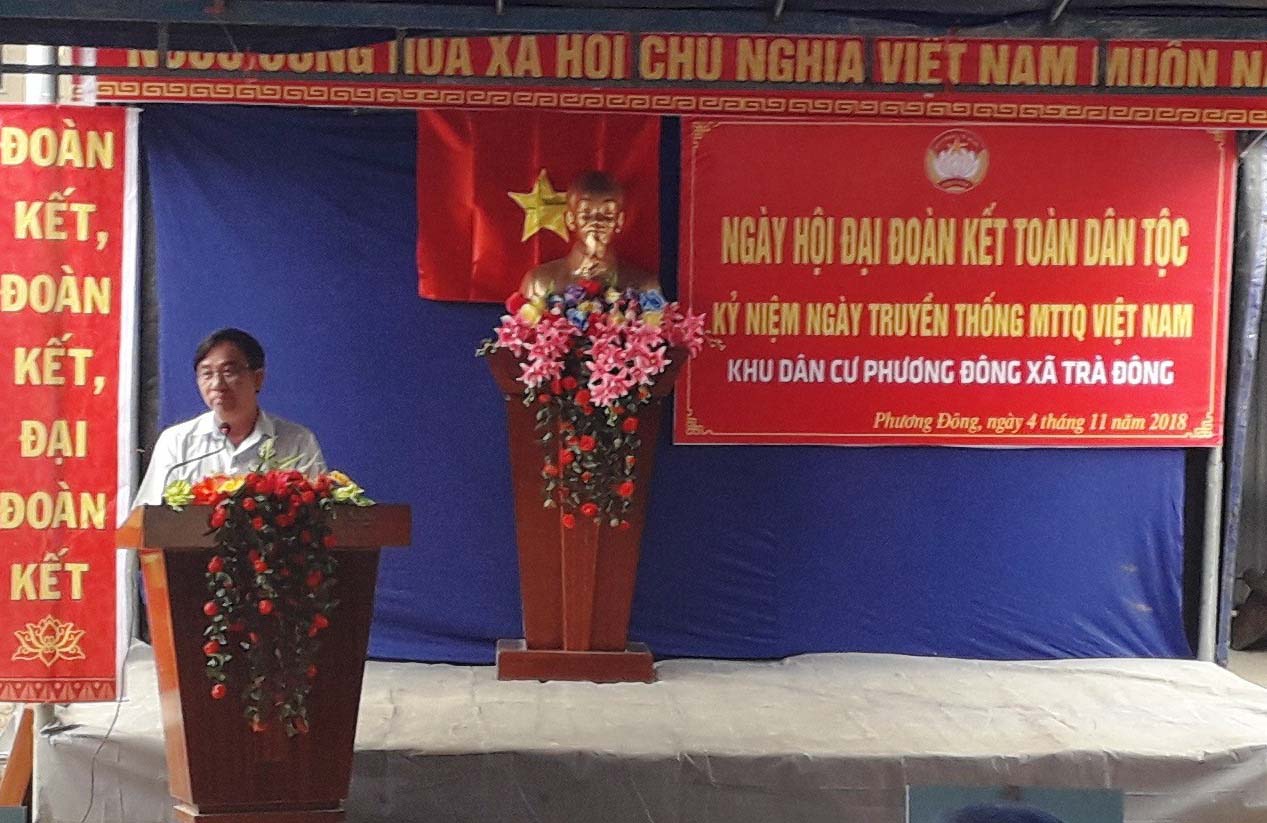 Về dự Ngày hội với bà con nhân dân thôn Phương Đông có ông Trần Xuân Vinh- UVBTV Tỉnh ủy, Chủ nhiệm Ủy ban Kiểm tra Tỉnh ủy, ông Lê Thái Bình- Phó Chủ tịch Ủy ban MTTQ Việt Nam tỉnh; bà Huỳnh Thị Thùy Dung- TUV, Bí thư Huyện ủy, Chủ tịch HĐND huyện; ông Nguyễn Hữu Trung- Phó Chủ tịch Ủy ban MTTQ Việt Nam huyện; các đồng chí Huyện ủy viên, đại biểu HĐND huyện đứng điểm phụ trách xã Trà Đông. Cùng đại diện lãnh đạo Đảng ủy, HĐND-UBND-UB MTTQ Việt Nam xã Trà Đông.