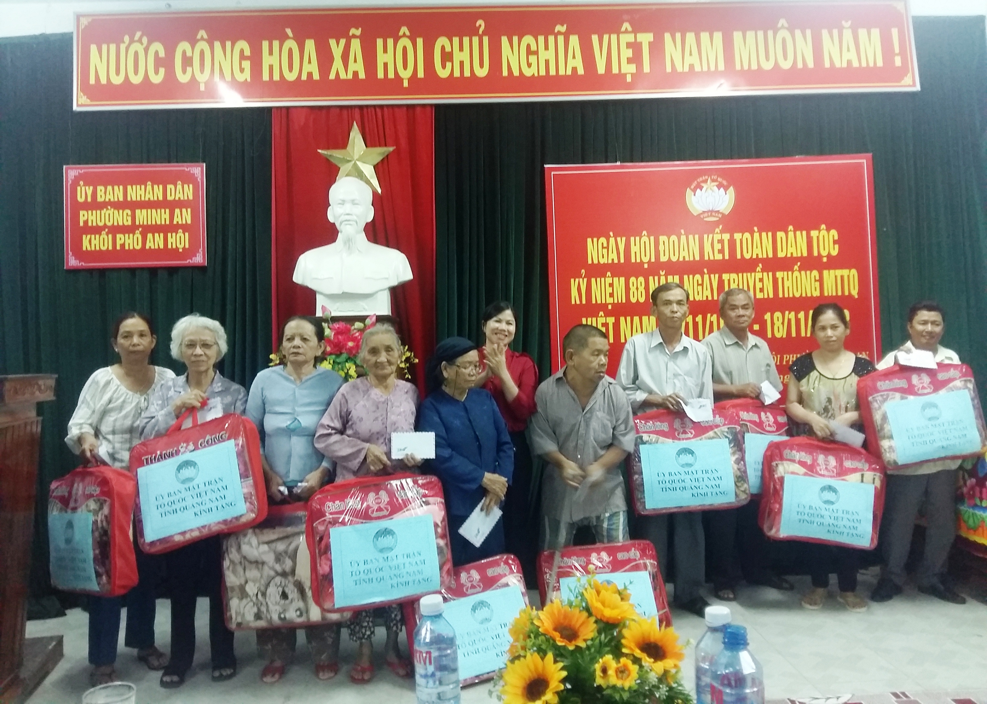 Tối cùng ngày, bà Nguyễn Thị Thanh Thu, UVTT -Trưởng ban Dân chủ - Pháp luật Ủy ban MTTQ Việt Nam tỉnh dự Ngày Hội đại đoàn kết tại KDC Khối phố An Hội, phường Minh An, thành phố Hội An và trao 10 suất quà cho hộ nghèo.