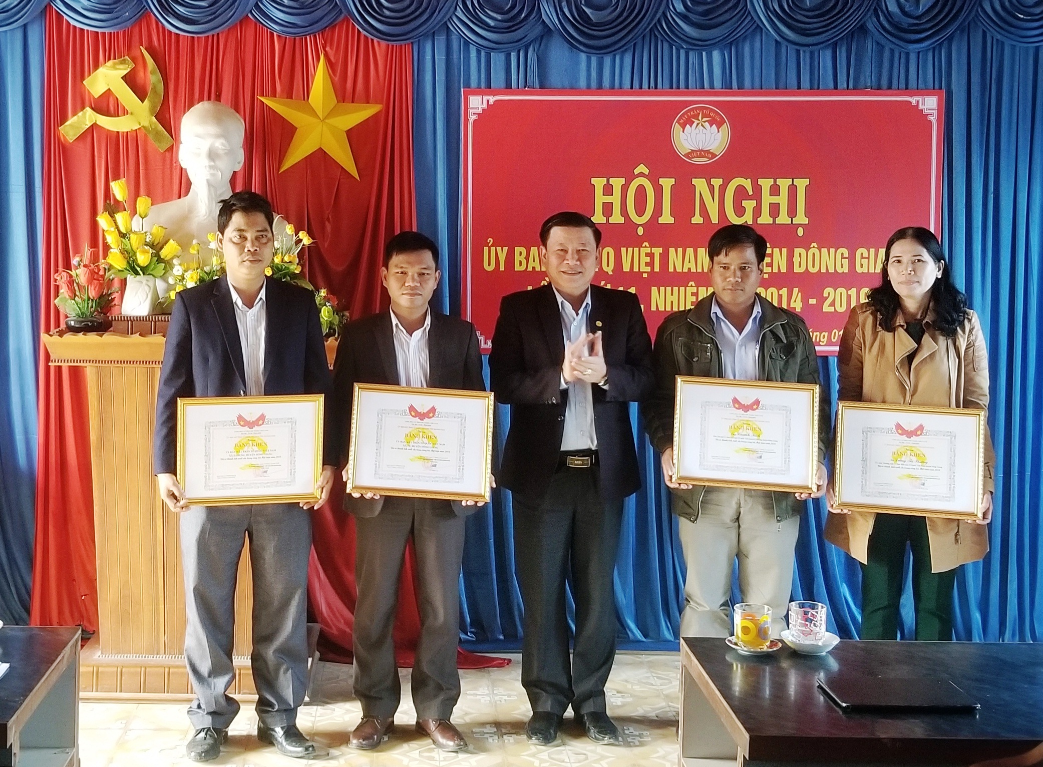 Hội nghị cũng đã trao kỷ niệm chương “Vì sự nghiệp Đại đoàn kết dân tộc” cho 6 cá nhân; trao tặng bằng khen của Ủy ban Trung ương MTTQ Việt Nam và Ủy ban MTTQ Việt Nam tỉnh cho 4 tập thể, 3 cá nhân; UBND huyện, UBMTTQVN huyện trao tặng giấy khen cho 15 tập thể và 12 cá nhân đã đạt thành tích xuất sắc trong công tác Mặt trận năm 2018.