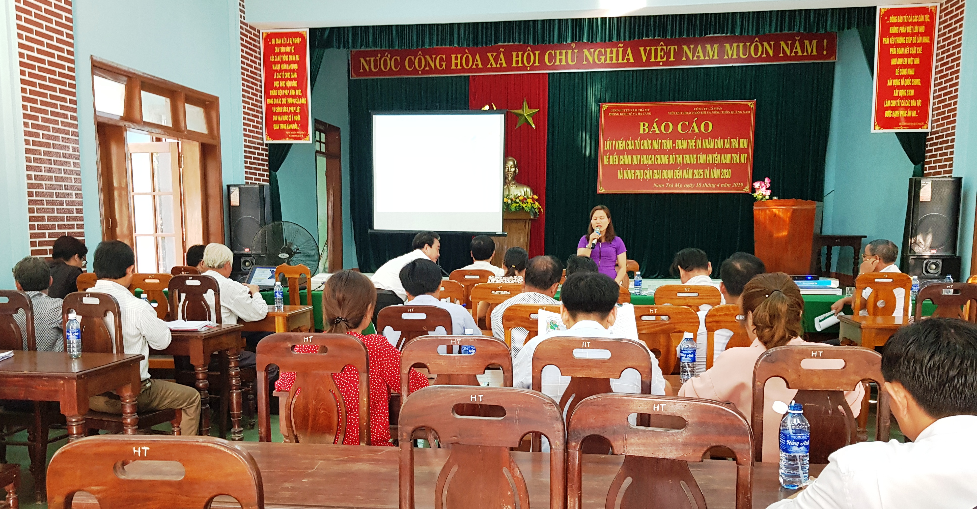 Chiều ngày 18/4/2019, Ban Thường trực Ủy ban MTTQ Việt Nam huyện Nam Trà My phối hợp với Phòng Kinh tế - Hạ tầng huyện tổ chức báo cáo và lấy ý kiến của Mặt trận, các tổ chức chính trị - xã hội và Nhân dân xã Trà Mai về ý tưởng quy hoạch chung đô thị trung tâm huyện Nam Trà My và vùng phụ cận giai đoạn năm 2025 và năm 2030.