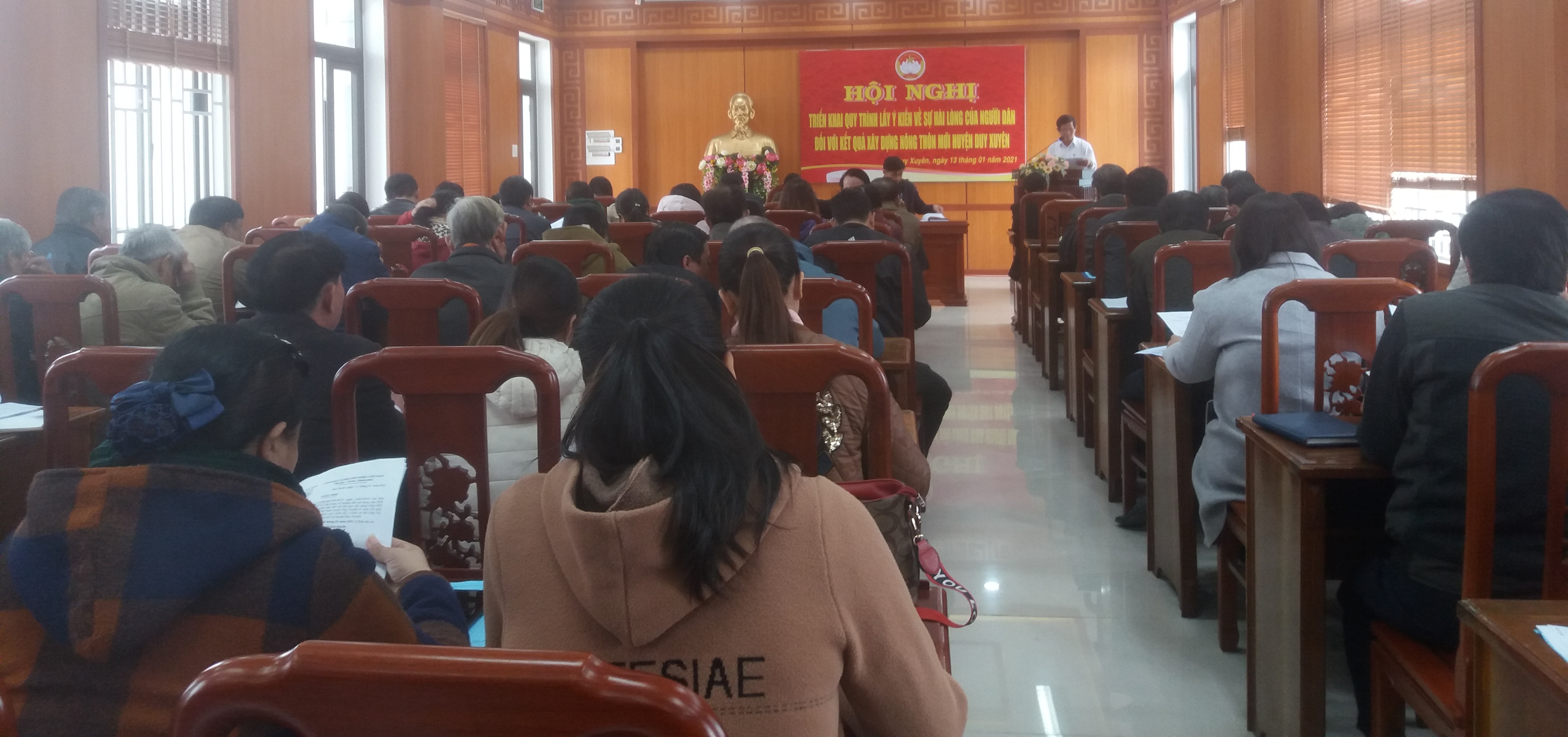 Tại Hội nghị, đại diện lãnh đạo Phòng NN&PTNT huyện báo cáo kết quả 09 tiêu chí huyện Duy Xuyên đạt chuẩn huyện NTM năm 2020. Bên cạnh đó, Ban Thường trực Ủy ban MTTQ Việt Nam huyện quán triệt kế hoạch, hướng dẫn về nội dung, hình thức, thời điểm, tỷ lệ lấy ý kiến, trình tự triển khai các bước tiến hành lấy ý kiến của Nhân dân về kết quả xây dựng nông thôn mới của huyện Duy Xuyên. Toàn huyện phát 24.275 phiếu, tương ứng với 66,47% số hộ gia đình của 14 xã, thị trấn trên địa bàn huyện; thực hiện việc lấy ý kiến trong vòng 15 ngày, kể từ khi lấy ý kiến đến khi tổng hợp hoàn thiện kết quả lấy ý kiến (Từ ngày 15/01/2021 đến hết ngày 29/01/2021).