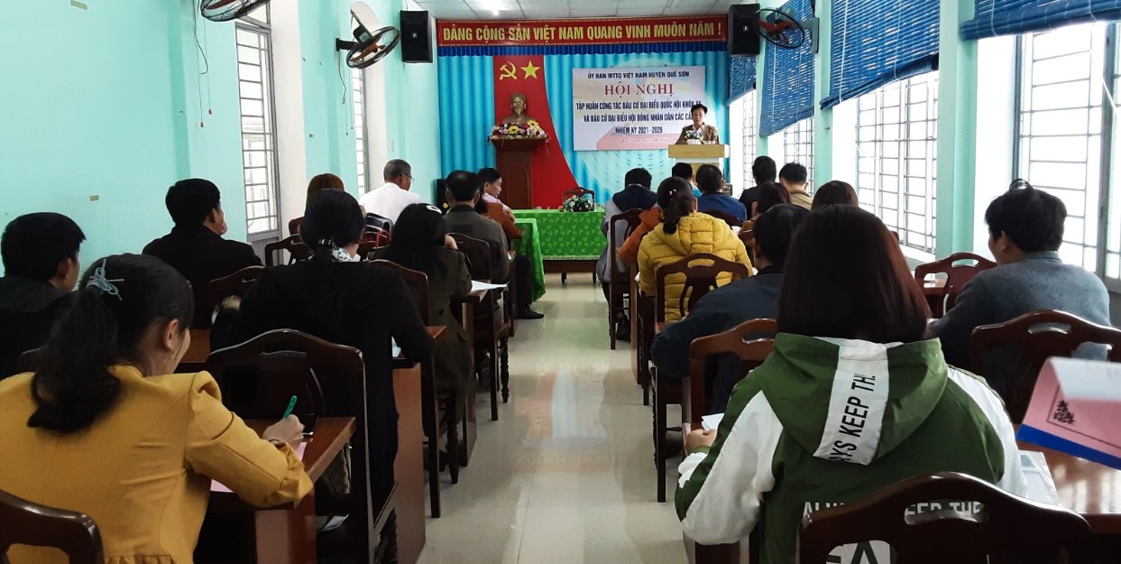 Quế Sơn: Ngày 28/01/2021, Ban Thường trực Ủy ban MTTQ Việt Nam huyện tổ chức Hội nghị tập huấn công tác bầu cử đại biểu Quốc hội khóa XV và đại biểu Hội đồng nhân dân các cấp, nhiệm kỳ 2021 - 2026 cho 110 đại biểu là đại diện lãnh đạo các đoàn thể chính trị - xã hội huyện, Ban Thường trực Ủy ban MTTQ Việt Nam 13 xã, thị trấn và Trưởng ban Công tác mặt trận 74 khu dân cư trên địa bàn huyện.