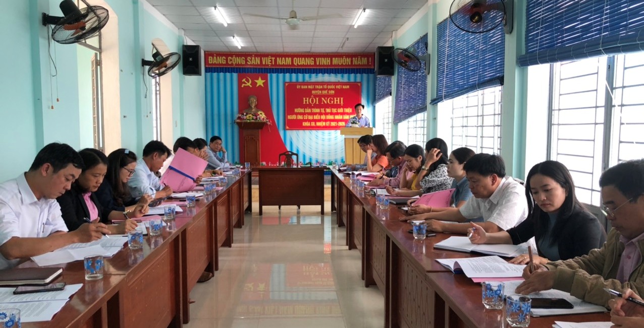 * Quế Sơn: Ngày 23/02/2021, Ban Thường trực Ủy ban MTTQ Việt Nam huyện tổ chức Hội nghị tập huấn hướng dẫn trình tự, thủ tục giới thiệu người ứng cử đại biểu Hội đồng nhân dân huyện khóa XII, nhiệm kỳ 2021 - 2026 cho gần 40 đại biểu là đại diện lãnh đạo các cơ quan, ban, ngành huyện và Ban Thường trực Ủy ban MTTQ Việt Nam xã, thị trấn. dự hội nghị có ông Phạm Đình Bảy - UVBTV, Phó Chủ tịch HĐND huyện, ông Lý Xuân Phong - UVBTV, Chủ tịch Uỷ ban MTTQ Việt Nam huyện cùng các vị trong Ban Thường trực Uỷ ban MTTQ Việt Nam huyện.