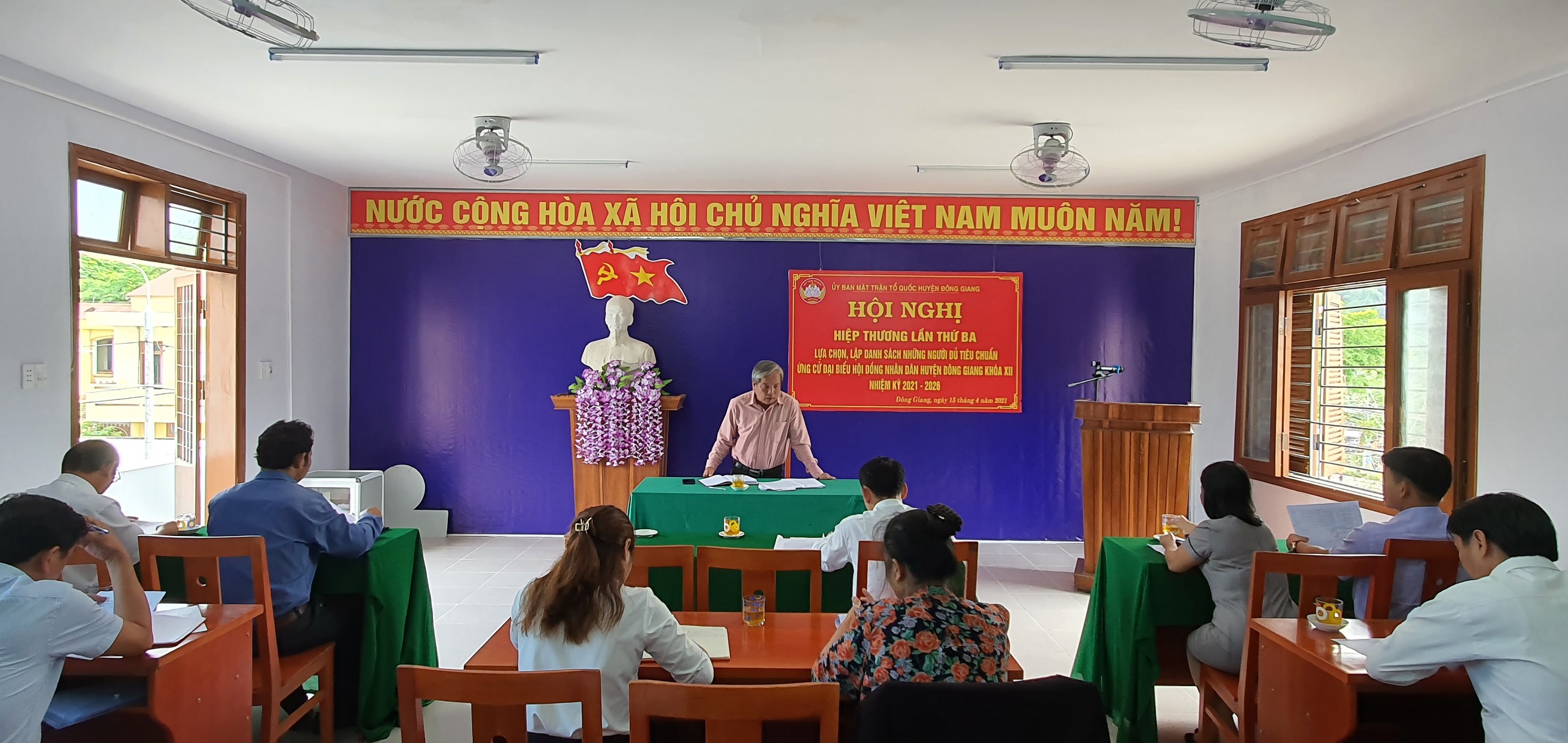 Đông Giang: Sáng ngày 15/4/2021, Ban Thường trực Ủy ban MTTQ Việt Nam huyện tổ chức Hội nghị hiệp thương lần thứ Ba lựa chọn, lập danh sách những người đủ tiêu chuẩn ứng cử đại biểu HĐND huyện khóa XII, nhiệm kỳ 2021-2026. Sau hai lần hiệp thương toàn huyện có 53 vị đại biểu được giới thiệu tham gia ứng cử đại biểu HĐND huyện, tại hội nghị hiệp thương lần này thống nhất chốt danh sách còn 49 đại biểu đảm bảo đủ điều kiện, tiêu chuẩn để giới thiệu tham gia ứng cử để bầu chọn 30 đại biểu HĐND huyện khóa XII, nhiệm kỳ 2021-2026.