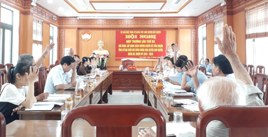 Với tinh thần dân chủ, trách nhiệm, sau khi thảo luận, 100% đại biểu dự hội nghị đã thống nhất biểu quyết không đưa 01 (một) trường hợp có đơn xin rút vào danh sách người ứng cử đại biểu HĐND huyện khoá XII, nhiệm kỳ 2021-2026 và thống nhất lập danh sách những người đủ tiêu chuẩn ứng cử đại biểu HĐND huyện Duy Xuyên khoá XII, nhiệm kỳ 2021-2026 có 51 người, trong đó nữ chiếm tỷ lệ 35,29%, người ngoài đảng 7,84%, trẻ tuổi 41,17%.