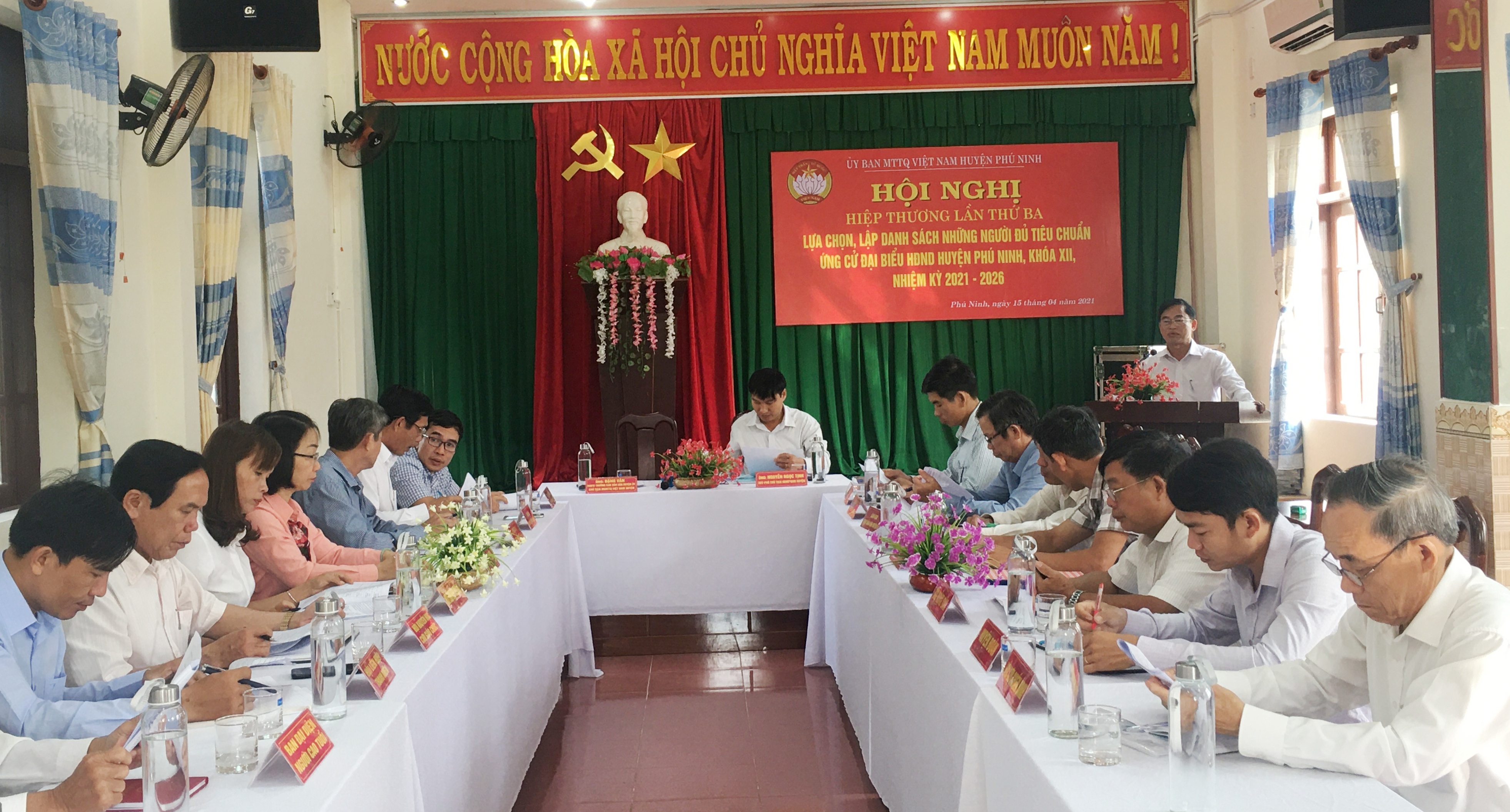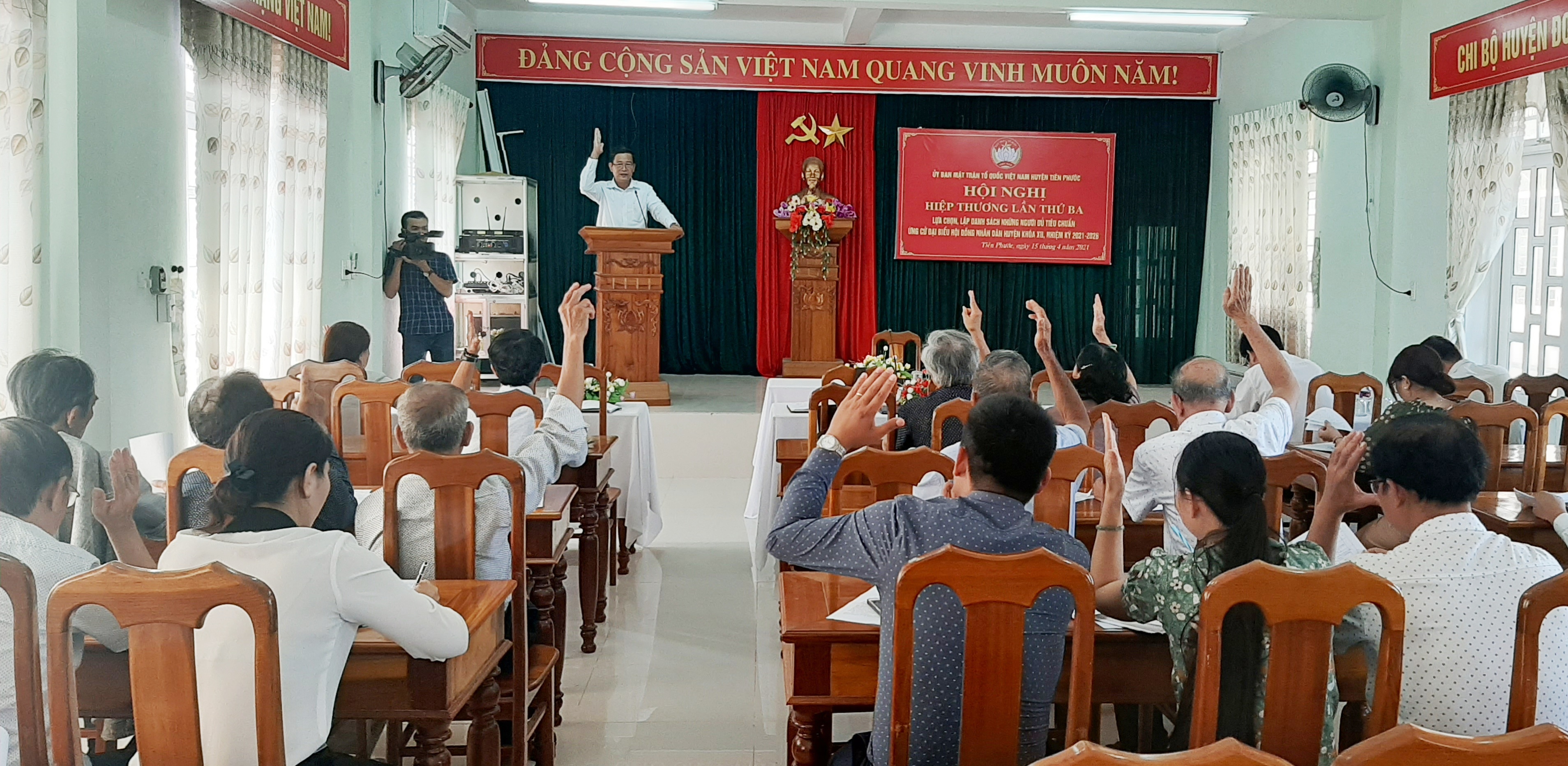 Tiên Phước: Ngày 15 tháng 4 năm 2021, Ban Thường trực Uỷ ban MTTQ Việt Nam huyện tiến hành Hội nghị hiệp thương lần thứ ba để lựa chọn, lập danh sách những người đủ tiêu chuẩn ứng cử đại biểu Hội đồng nhân dân huyện khoá XII, nhiệm kỳ 2021-2026.