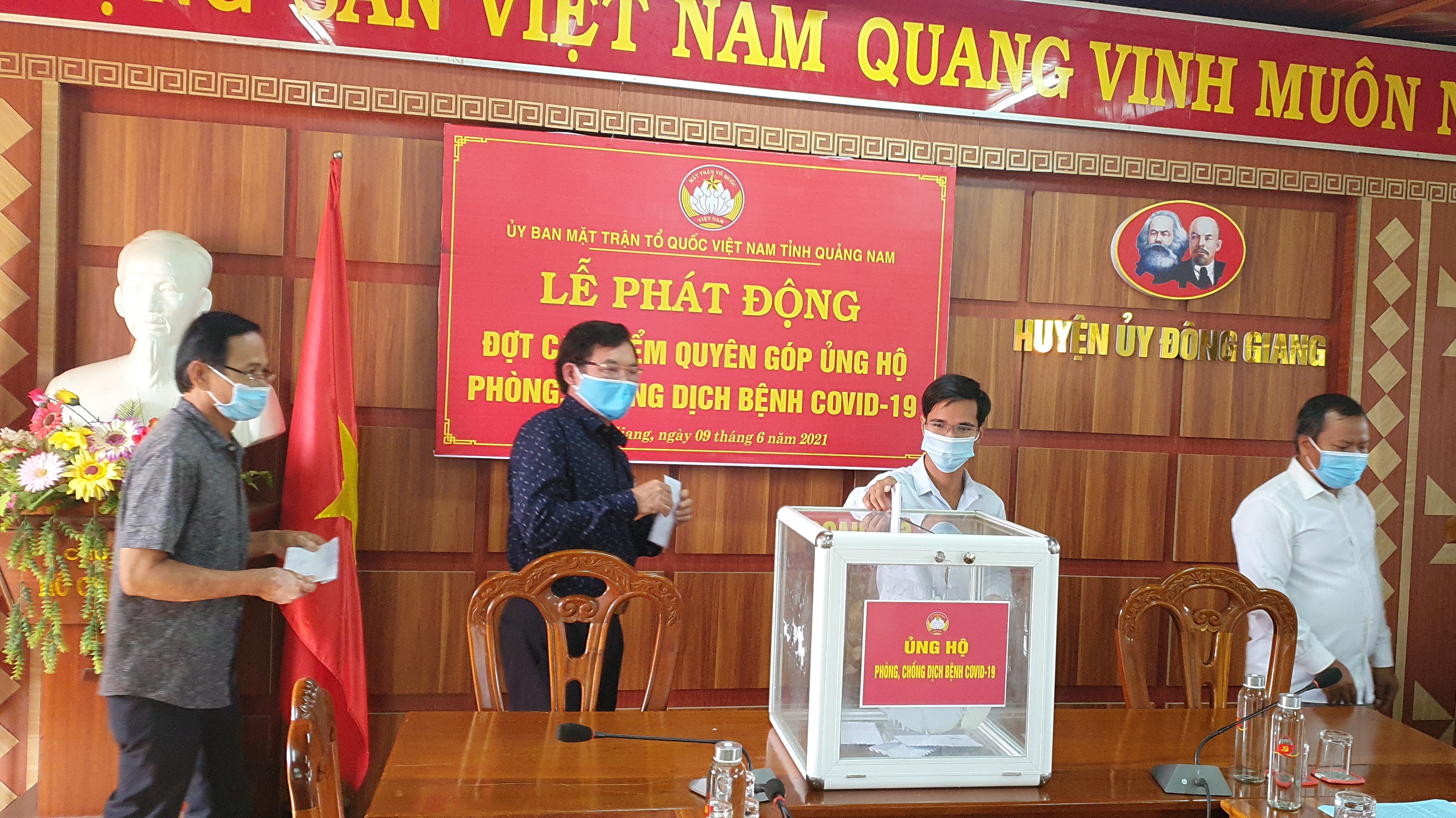 Đông Giang: Sáng ngày 09 và ngày 10/6/2021, Ban Thường trực Ủy ban MTTQ Việt Nam huyện phối hợp cùng với Thường trực HĐND, UBND, Văn phòng Huyện ủy tổ chức phát động đợt cao điểm quyên góp ủng hộ phòng, chống COVID-19 trên địa bàn huyện. Tính đến ngày 10/6/2021, Ban Thường trực Ủy ban MTTQ Việt Nam huyện đã vận động quyên góp ủng hộ phòng, chống COVID-19 trên địa bàn huyện đạt 45.750.000đ.