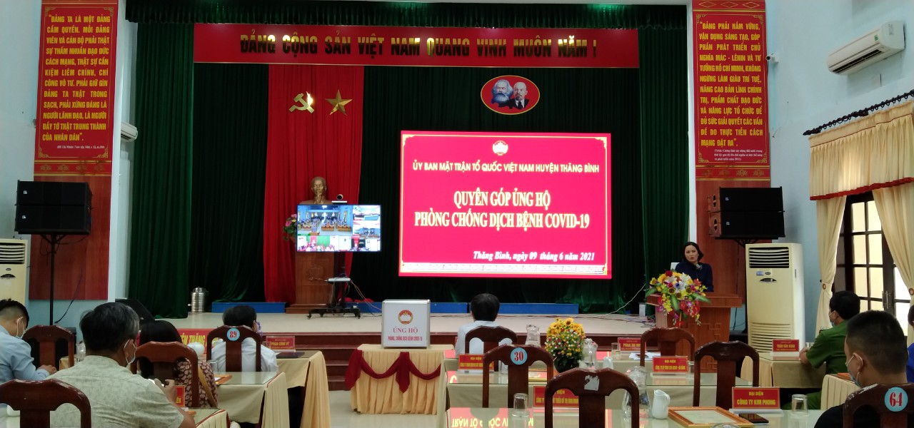 Tại điểm cầu huyện Thăng Bình, Ban Thường trực Ủy ban MTTQ Việt Nam huyện đã tổ chức quyên góp ủng hộ phòng, chống dịch Covid-19 và nhận đăng ký gần 1 tỷ đồng ủng hộ từ các cơ quan, đơn vị, doanh nghiệp trên địa bàn huyện, trong đó điểm cầu tại huyện nhận đăng ký 715 triệu đồng, tại điểm cầu của 22 xã, thị trấn nhận đăng ký 222 triệu đồng.
