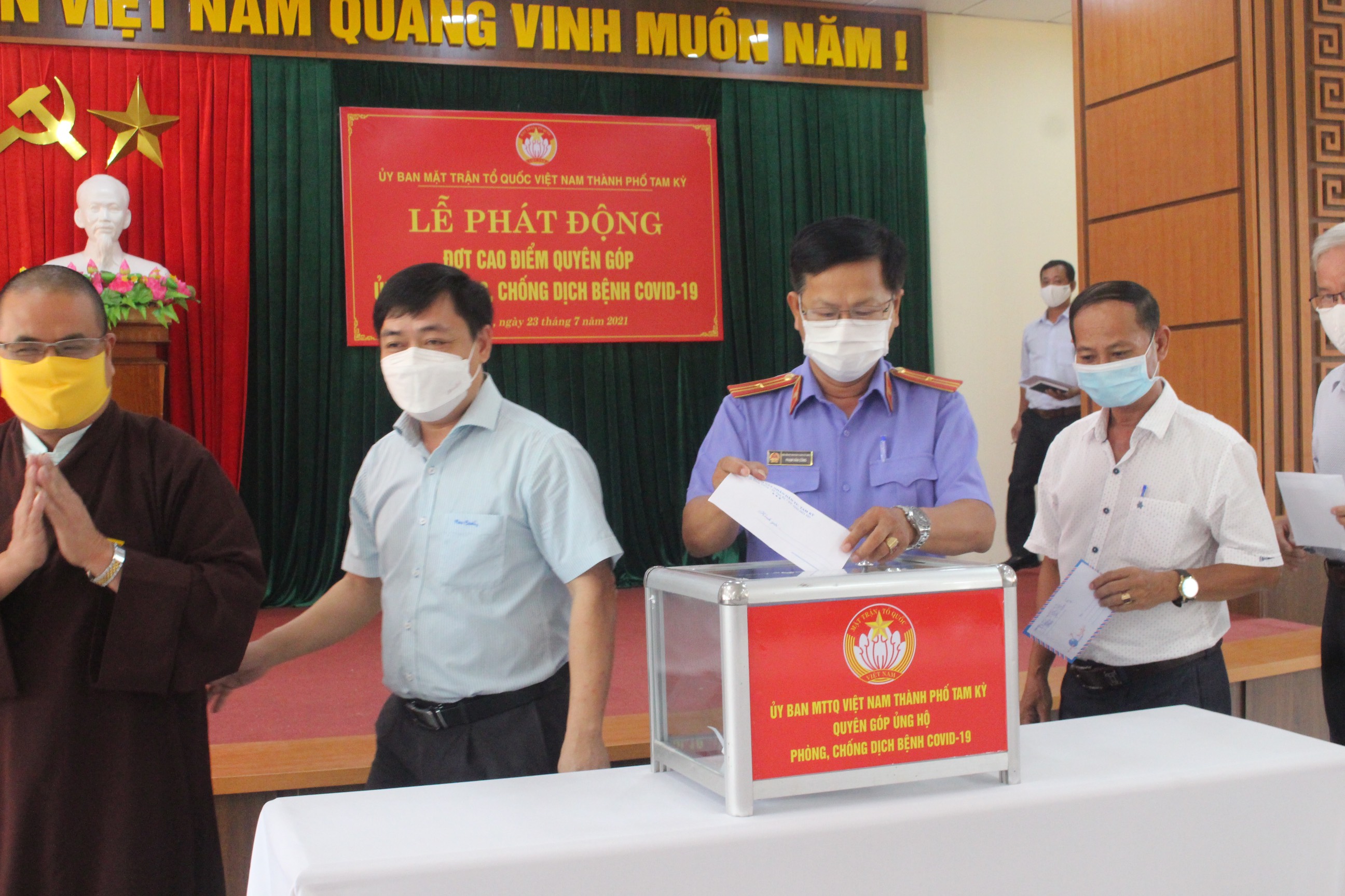 Tại buổi Lễ phát động, ông Dương Văn Chí -UVBTV Thành ủy, Chủ tịch Ủy ban Mặt trận Tổ quốc Việt Nam thành phố cho biết, nhiều địa phương trong cả nước đang trải qua thời kỳ khó khăn chưa từng có trước đại dịch Covid-19. Đặc biệt, tại Tam Kỳ đã có rất nhiều F1 đang phải cách ly tập trung.Thành phố cũng đã tổ chức đón hơn 70 bà con đồng hương từ thành phố Hồ Chí Minh, các nơi khác về và sẽ thực hiện cách ly theo quy định. Thay mặt Ban Thường trực Ủy ban MTTQ Việt Nam thành phố, ông Dương Văn Chí tiếp nhận hơn 500 triệu đồng từ các cơ quan, doanh nghiệp, nhà hảo tâm, các chức sắc, tín đồ tôn giáo và đại diện cán bộ và nhân dân các xã, phường trên địa bàn thành phố, trong đó, Công ty CP Môi trường đô thị Quảng Nam và Công ty CP Thương mại Bất động sản Tây Bắc mỗi đơn vị ủng hộ 100 triệu đồng.