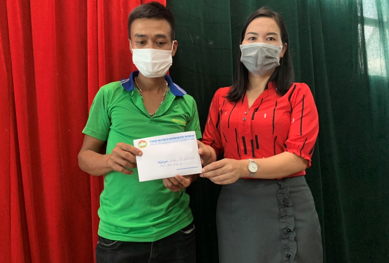 Bà Nguyễn Thị Huệ- Chủ tịch UBMTTQVN huyện trao tiền hỗ trợ cho anh Nguyễn Xuân Trường