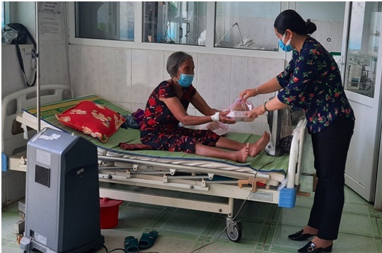 Bà Nguyễn Thị Hồng, UVBTV, Trưởng Ban Dân vận Huyện ủy, Chủ tịch UBMTTQ Việt Nam huyện trao suất cơm cho bệnh nhân tại Trung tâm Y tế huyện