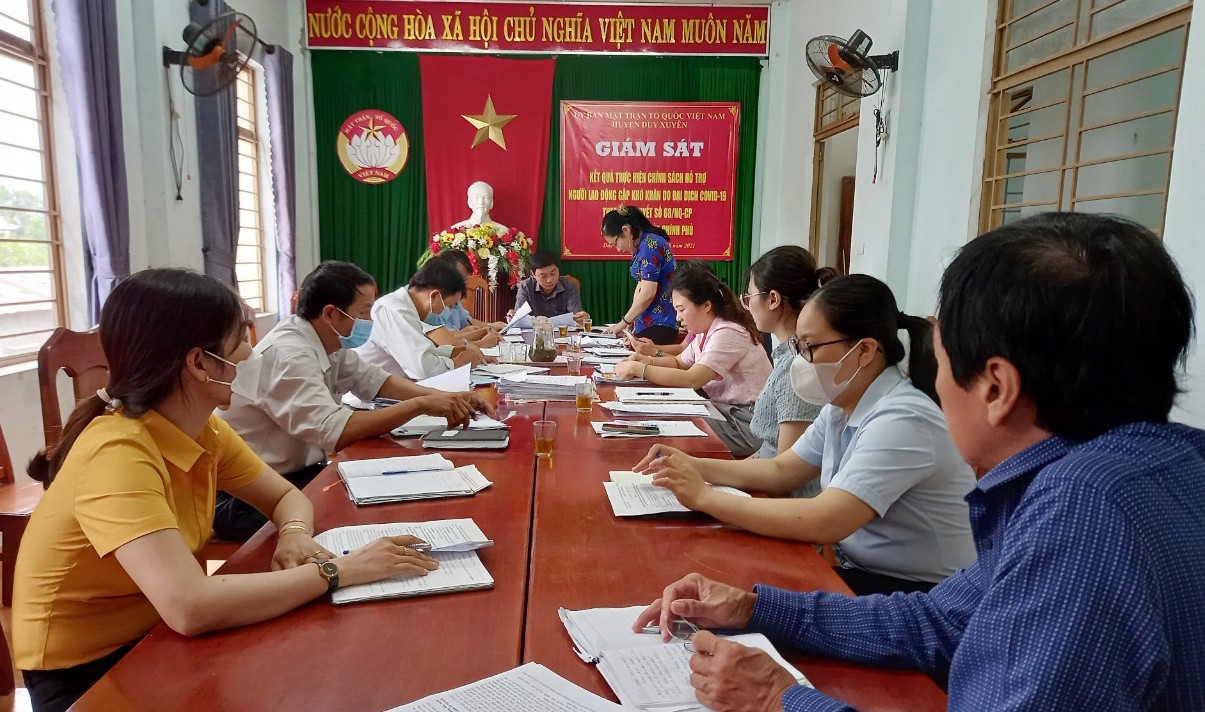 Qua giám sát và kiểm tra, UBND từ huyện đến cơ sở đã ban hành các văn bản chỉ đạo, hướng dẫn tổ chức triển khai thực hiện việc hỗ trợ theo Nghị quyết số 68/NQ-CP, ngày 01/7/2021; Quyết định số 23/2021/QĐ/TTg ngày 07/7/2021 của Thủ tướng Chính phủ; Nghị quyết số 45/NQ-HĐND ngày 22/7/2021 của HĐND tỉnh và các văn bản pháp luật có liên quan đến người dân gặp khó khăn do đại dịch COVID-19 kịp thời. Ủy ban MTTQ Việt Nam các xã, thị trấn, Ban công tác Mặt trận ở KDC đã phối hợp cùng đoàn thể tại địa phương tăng cường công tác tuyên truyền bằng nhiều hình thức để phổ biến các quy định, hướng dẫn, các tiêu chí xác lập các nhóm đối tượng đến các tầng lớp nhân dân; tham gia rà soát, lập danh sách; tổ chức giám sát song trùng, chặt chẽ các quy trình từ việc lập danh sách đến khi chi trả. Hiện nay, các nhóm đối tượng trẻ em và người đang điều trị COVID-19, cách ly y tế, hộ kinh doanh, người lao động tạm hoãn HĐLĐ nghỉ việc không hưởng lương đã được rà soát, lập danh sách, chấm trùng, phê duyệt danh sách các đối tượng thụ hưởng chính sách đảm bảo theo quy định nghị quyết 68/NQ-CP; Đã xét và phê duyệt hỗ trợ tiền ăn đối với người cách ly tập trung, hỗ trợ người lao động không giao kết hợp đồng lao động theo Nghị quyết 45/HĐND tỉnh là 1.927 đối tượng. Đối với các nhóm đối tượng người lao động không giao kết hợp đồng lao động đang được UBND cấp xã, thị trấn tiếp tục tổng hợp, thống kê, lập danh sách, tổ chức xét duyệt, trình cấp có thẩm quyền thẩm định để UBND huyện phê duyệt và Ủy ban MTTQ Việt Nam huyện, cấp xã tiến hành tổ chức giám sát theo quy định.