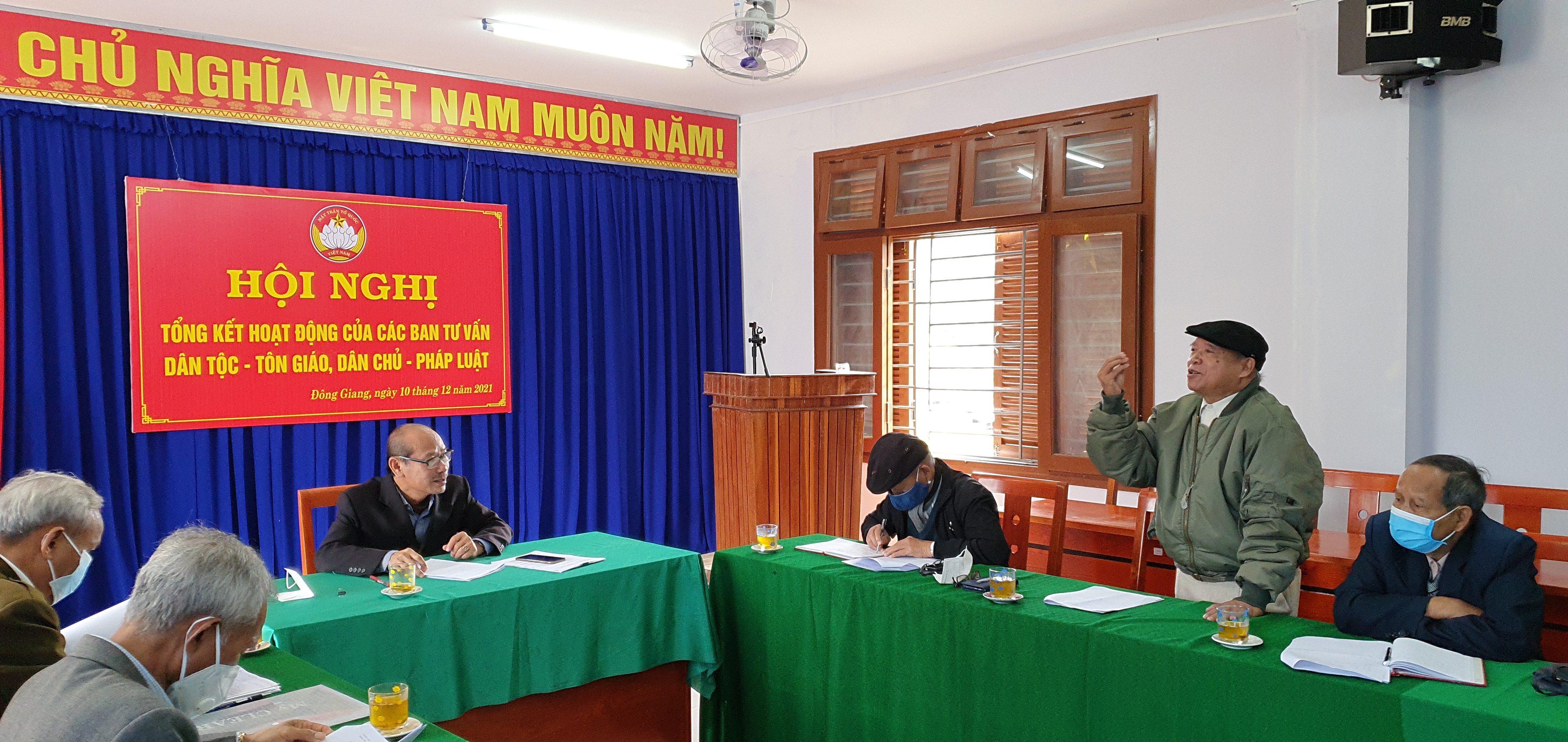 Thực hiện quy chế làm việc của Ban Tư vấn Ủy ban MTTQ Việt Nam huyện nhiệm kỳ 2019-2024, các Ban Tư vấn huyện tích cực cùng với Ủy ban MTTQ Việt Nam huyện xây dựng chương, kế hoạch đề ra để thực hiện nhiệm vụ của mình giúp cho Ban Thường trực Ủy ban MTTQ Việt Nam huyện triển khai thực hiện các Kết luận của Trung ương, Nghị quyết của tỉnh, huyện... Trưởng, Phó các Ban tư vấn tham gia đầy đủ các cuộc họp, trực tiếp tham dự các Hội nghị tham gia góp ý chất lượng nhiều văn bản dự thảo của HĐND, UBND huyện liên quan đến các lĩnh vực kinh tế - xã hội, dân tộc - tôn giáo và công tác đối ngoại nhân dân; tích cực tham gia các hoạt động giám sát, phản biện xã hội của Ủy ban MTTQ Việt Nam huyện tổ chức như: Hội nghị phản biện xã hội đối với Đề án phát triển kinh tế vườn, kinh tế trang trại trên địa bàn huyện Đông Giang giai đoạn 2022-2025 vào ngày 06/12/2021.