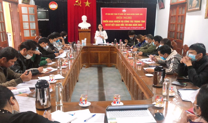 Ngày 13/01/2022, Ban Thường trực Ủy ban MTTQ Việt Nam huyện Phước Sơn tổ chức Hội nghị nghị triển khai nhiệm vụ trọng tâm công tác Mặt trận và ký cam kết giao ước thi đua năm 2022. Đồng chí Nguyễn Thị Bích Diễm - HUV, Phó Chủ tịch Ủy ban MTTQ Việt Nam huyện chủ trì hội nghị.