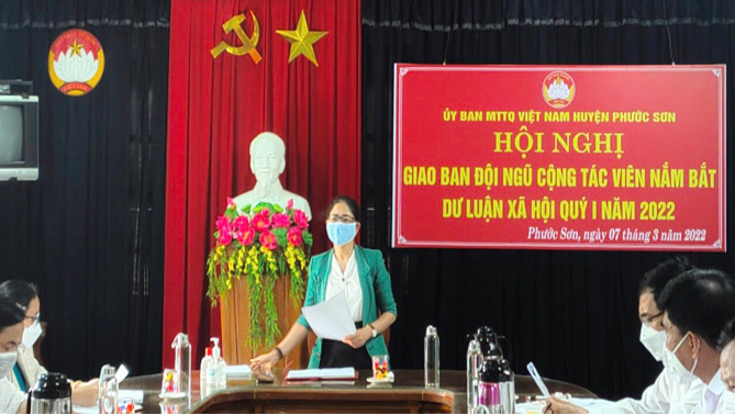 Kết luận Hội nghị, đồng chí Nguyễn Thị Bích Diễm ghi nhận và đánh giá cao sự tích cực của các đồng chí cộng tác viên trong nắm bắt tình hình, phản ánh dư luận xã hội; đồng thời đề nghị trong thời gian tới, các đồng chí cộng tác viên cần sâu sát cơ sở, địa bàn dân cư để kịp thời nắm bắt tình hình tư tưởng, dư luận cán bộ, đảng viên và Nhân dân về công tác phòng chống dịch Covid-19; việc triển khai thực hiện các chủ trương, chính sách của Đảng, Nhà nước, của tỉnh, huyện; việc triển khai, thi công các công trình dự án; những vấn đề phát sinh ở cơ sở, đặc biệt về những vấn đề đang được dư luận Nhân dân quan tâm để tổng hợp, báo cáo về Ban Thường trực Ủy ban MTTQ Việt Nam huyện và kiến nghị với cấp uỷ Đảng, chính quyền kịp thời giải quyết những nguyện vọng chính đáng của Nhân dân, tạo sự thống nhất và đồng thuận trong Nhân dân./.