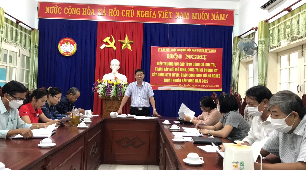 Chiều ngày 31/3/2022, Ban Thường trực Ủy ban MTTQ Việt Nam huyện Duy Xuyên chủ trì tổ chức Hội nghị hiệp thương với các tổ chức thành viên củng cố, duy trì và thành lập mô hình mới, công trình chung tay xây dựng nông thôn mới, đô thị văn minh; phân công giúp đỡ hộ nghèo thoát nghèo bền vững năm 2022.