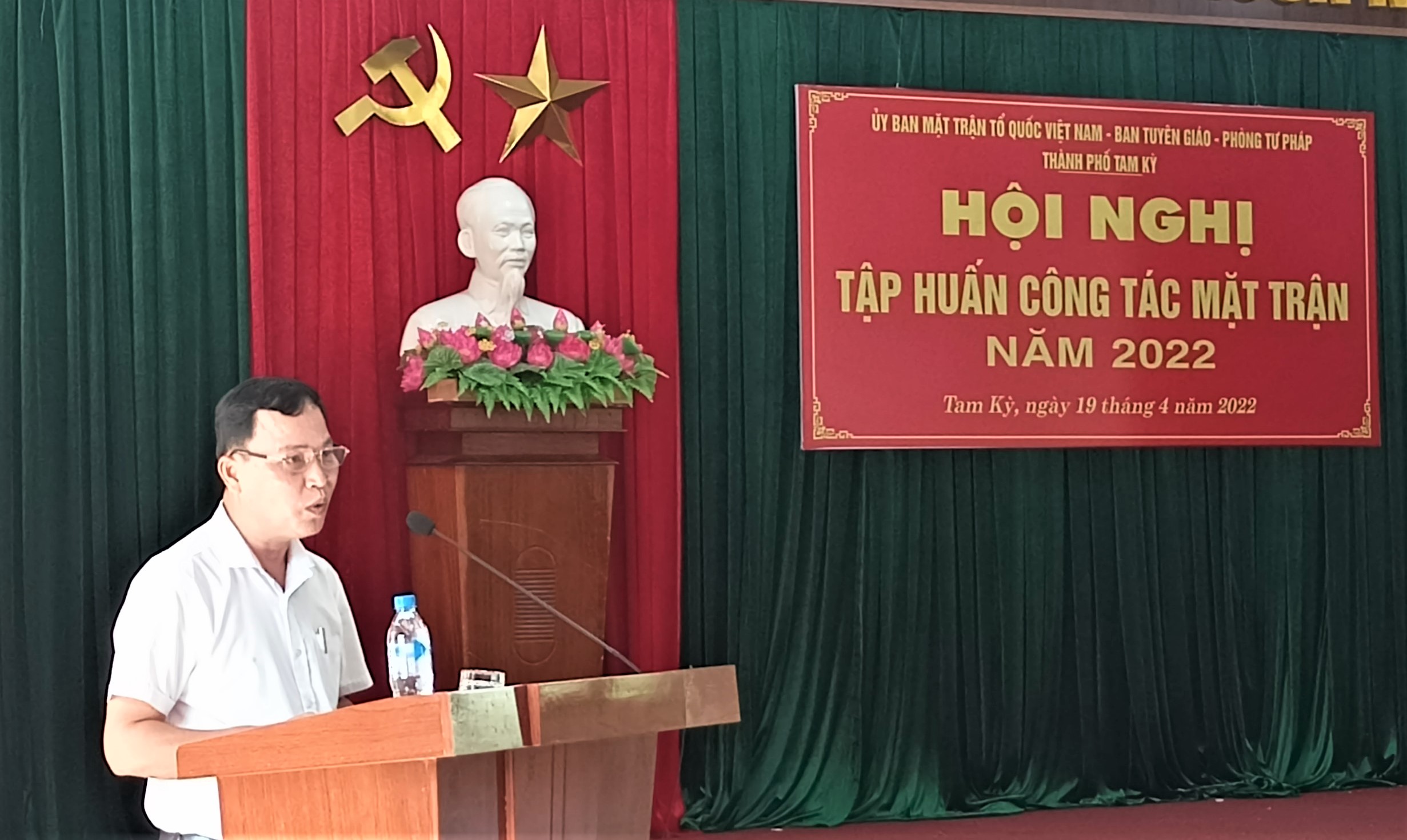 * Tam Kỳ: Sáng ngày 19/4, Ban Thường trực Ủy ban MTTQ Việt Nam thành phố Tam Kỳ phối hợp với Phòng Tư pháp và Ban Tuyên giáo Thành ủy tổ chức tập huấn, bồi dưỡng công tác Mặt trận năm 2022 cho cán bộ chuyên trách Ủy ban MTTQ Việt Nam của 13 xã, phường và Trưởng Ban Công tác Mặt trận ở khu dân cư. Hội nghị diễn ra 02 ngày (19, 20/4/2022).