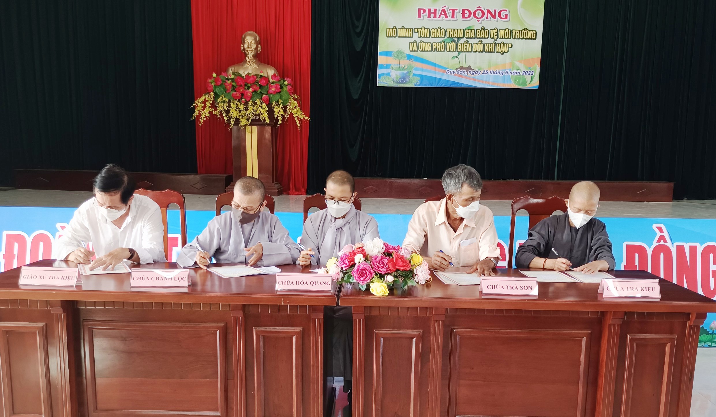 Thực hiện tốt Quyết định số 524/QĐ-TTg ngày 01/4/2021 của Thủ tướng Chính phủ về Đề án “Trồng 01 tỷ cây xanh giai đoạn 2021-2025”. Hiện thực hoá những cam kết của các tôn giáo đối với nhiệm vụ bảo vệ môi trường và ứng phó với biến đổi khí hậu bằng các hoạt động cụ thể, phù hợp với đặc điểm của từng tôn giáo, địa bàn dân cư. Nâng cao vai trò, trách nhiệm, sự đóng góp tích cực của chức sắc, chức việc và tín đồ các tôn giáo đối với nhiệm vụ bảo vệ môi trường và ứng phó với biến đổi khí hậu góp phần cùng chung tay với các ban, ngành, các tổ chức chính trị - xã hội trên địa bàn toàn thị xã triển khai thực hiện Cuộc vận động “Toàn dân đoàn kết xây dựng NTM, đô thị văn minh” gắn với mô hình “KDC sáng - xanh - sạch - đẹp gắn với phong trào tình nguyện nhân dân”, phong trào “Mỗi tháng dành một ngày vì môi trường sáng – xanh – sạch – đẹp” … do Mặt trận thị xã phát động. Tổ chức ra quân vệ sinh môi trường, thu gom xử lý chất thải rắn; tuyên truyền, khuyến khích cộng đồng không sử dụng túi nilon khó phân hủy và các sản phẩm nhựa dùng một lần. Hưởng ứng ngày môi trường thế giới (05/6) và Tháng hành động vì môi trường năm 2022, các tổ chức tôn giáo trên địa bàn thị xã đồng loạt quân trồng cây xanh trên các tuyến đường: Giáo hội Phật giáo Việt Nam thị xã Điện Bàn hỗ trợ kinh phí mua cây xanh trồng tuyến đường dài 500m thôn Tam Thạnh xã Điện Quang trị giá 50 triệu đồng; Chùa Hồng Đức – xã Điện Hồng hỗ trợ 30 triệu đồng; Các cơ sở tôn giáo xã Điện Phương hỗ trợ 10 triệu đồng; Chùa Ngọc Châu – xã Điện Thọ hỗ trợ 15 triệu mua 300 cây xanh …