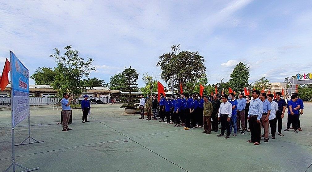 Sau buổi lễ, ra quân diễu hành tuyên truyền ngày MTTG (5/6), đồng thời tổ chức khởi động xây dựng mô hình “Bờ rào xanh” tại KDC Trà Va xã Sông Trà.