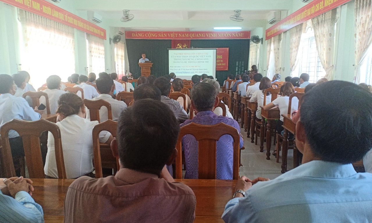 Các đại biểu được nghe Ông Nguyễn Bút - HUV, Phó Trưởng Ban tuyên giáo Huyện ủy triển khai một số vấn đề về lý luận và thực tiễn về chủ nghĩa xã hội và con đường đi lên chủ nghĩa xã hội ở Việt Nam và Ông Nguyễn Phi Hùng - Phó chủ tịch Ủy ban MTTQ Việt Nam tỉnh đã định hướng một số nội dung về vai trò nòng cốt chính trị của Mặt trận Tổ quốc Việt Nam trong xây dựng, chỉnh đốn Đảng và hệ thống chính trị.