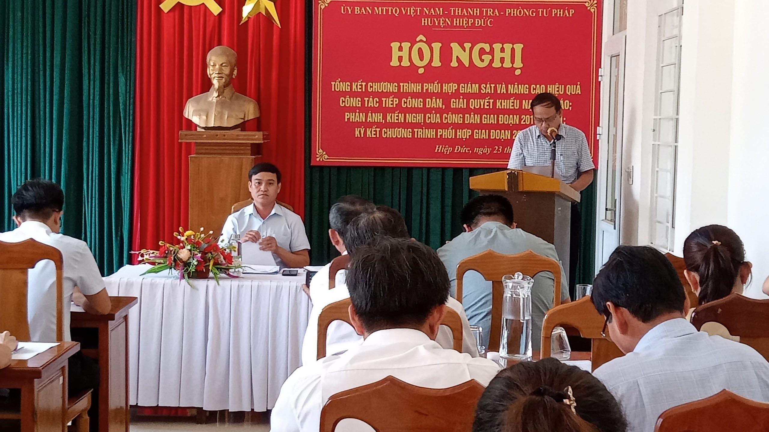 Phát biểu tại Hội nghị, ông Nguyễn Ngọc Hoàng Việt, HUV, Phó Chủ tịch UBND huyện đề nghị các cơ quan thời gian tới tăng cường chỉ đạo, hướng dẫn các cấp xã tổ chức triển khai thực hiện có hiệu quả các nội dung của CTPH. Thực hiện thường xuyên việc trao đổi, cung cấp thông tin giữa các cơ quan phối hợp về tình hình, diễn biến vụ việc KNTC và kết quả giải quyết KNTC theo quy định. Chú trọng lựa chọn, tổ chức giám sát những vụ việc KNTC có dấu hiệu vi phạm pháp luật làm ảnh hưởng đến quyền và lợi ích hợp pháp, chính đáng của công dân; những vụ việc KNTC đã có kết quả giải quyết của các cơ quan chức năng có thẩm quyền nhưng phát hiện có dấu hiệu vi phạm pháp luật hoặc có tình tiết mới công dân tiếp tục KNTC; những vụ việc KNTC tồn đọng, kéo dài, vượt cấp, đông người, phức tạp, có khả năng tạo “điểm nóng”. Định kỳ tổ chức bồi dưỡng, tập huấn nâng cao năng lực cho đội ngũ cán bộ, công chức. Đồng thời tổ chức tọa đàm chuyên đề về KNTC. Tăng cường phối hợp thực hiện tốt công tác tuyên truyền, phổ biến chính sách, pháp luật về tiếp công dân, giải quyết KNTC cho Nhân dân. Nâng cao chất lượng hoạt động trợ giúp pháp lý miễn phí bằng các hình thức thiết thực.