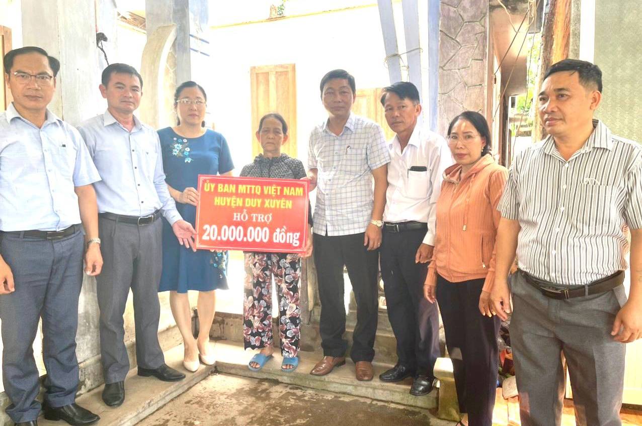 Sáng ngày 08/9/2022, lãnh đạo Ủy ban MTTQ Việt Nam huyện đã đến thăm, động viên và hỗ trợ số tiền 20 triệu đồng cho gia đình bà Nguyễn Thị Thu, sinh năm 1957 ở tại thôn Tây Sơn Đông, xã Duy Hải có nhà bị sập hoàn toàn phần mái do mưa lớn.