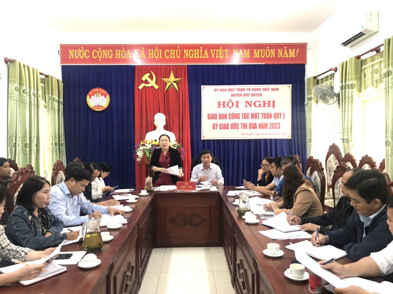 Ông Nguyễn Thanh Hải - UVBTV Huyện ủy, Chủ tịch Ủy ban MTTQ Việt Nam huyện Duy Xuyên, chủ trì hội nghị nhấn mạnh những nhiệm vụ trọng tâm: Năm 2023, Cần đổi mới nội dung, hình thức, nâng cao hiệu quả công tác thông tin, tuyên truyền, thực hiện có hiệu quả “Trang cộng đồng” (Fanpage) của MTTQ Việt Nam từ huyện đến cơ sở; tổ chức tổng kết 20 năm thực hiện Nghị quyết số 04/NQ-ĐCT ngày 01/8/2003 của Đoàn Chủ tịch Ủy ban Trung ương MTTQ Việt Nam về việc tổ chức “Ngày hội đại đoàn kết toàn dân tộc”; tổ chức đến thăm và hỗ trợ an sinh tại các huyện, xã kết nghĩa như huyện Phước Sơn và xã Chơ Chun, huyện Nam Giang; tiếp tục thực hiện tốt các cuộc vận động, các phong trào thi đua yêu nước, hoạt động giám sát và phản biện xã hội,… Đồng thời, nắm chắc tình hình dư luận xã hội, đời sống, tâm tư, nguyện vọng, tư tưởng và ý kiến, kiến nghị của Nhân dân kịp thời phản ánh đến các cơ quan có thẩm quyền để giải quyết (đặc biệt là ở các địa phương trọng điểm có nhiều dự án), tạo sự đồng thuận, thống nhất, tăng cường khối Đại đoàn kết toàn dân tộc, góp phần hoàn thành thắng lợi các mục tiêu phát triển kinh tế - xã hội, quốc phòng - an ninh của huyện nhà trong năm 2023.