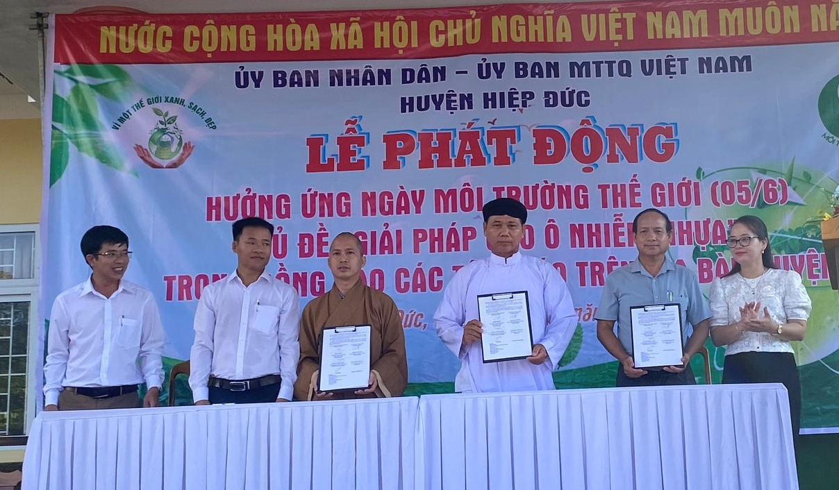 Hiệp Đức: Sáng ngày 01/6/2023, Ban Thường trực Ủy ban MTTQ Việt Nam huyện phối hợp với Ủy ban nhân dân huyện tổ chức Lễ phát động hưởng ứng Ngày Môi trường thế giới (05/6) năm 2023 trong đồng bào các tôn giáo trên địa bàn huyện với chủ đề “Giải pháp cho ô nhiễm nhựa”, trong đó tập trung thực hiện chiến dịch “Chống ô nhiễm nhựa”.
