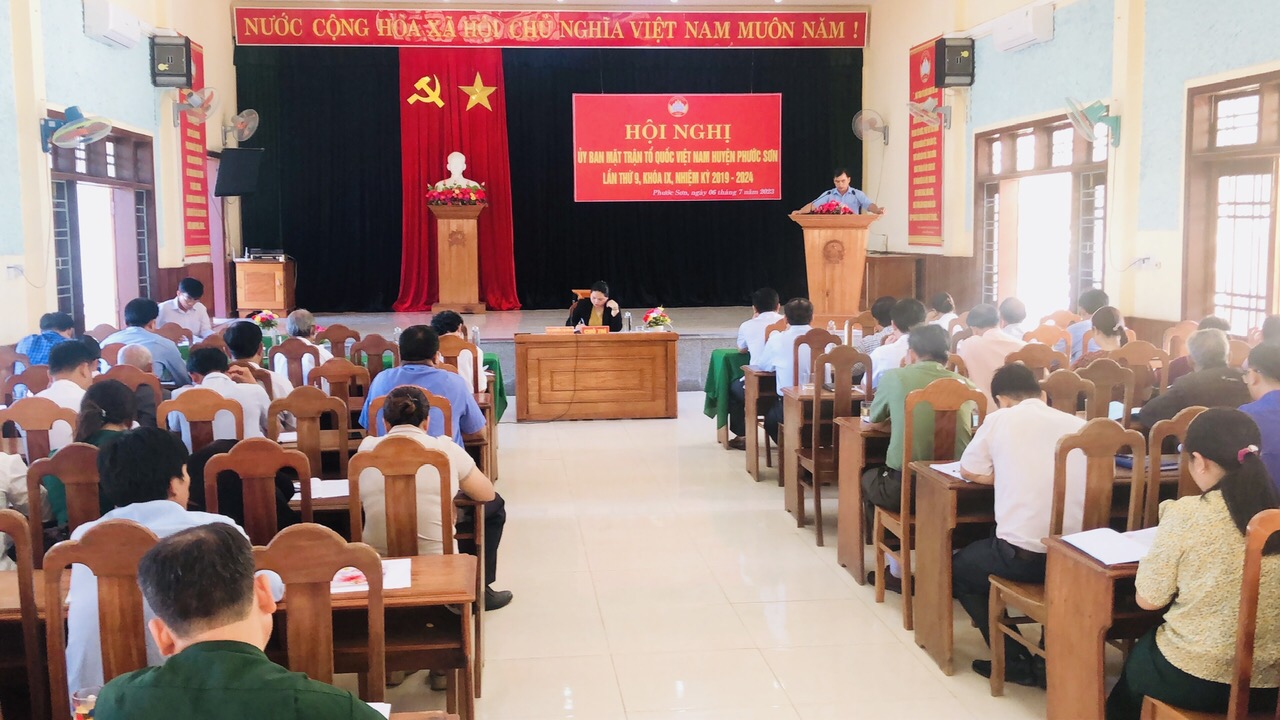 Sáng ngày 06/7/2023, Ủy ban MTTQ Việt Nam huyện Phước Sơn tổ chức Hội nghị lần thứ 9, nhiệm kỳ 2019-2024 nhằm đánh giá kết quả thực hiện công tác Mặt trận 6 tháng đầu năm 2023 và bàn giải pháp, nhiệm vụ công tác 6 tháng cuối năm. Dự Hội nghị có đồng chí Hồ Văn Phen- UVTV, Phó Chủ tịch HĐND huyện; đồng chí Đỗ Hoài Xoan - Phó Chủ tịch UBND huyện. Đồng chí Nguyễn Thị Hồng - UVBTV Huyện ủy, Trưởng ban Dân vận, Chủ tịch Ủy ban MTTQ Việt Nam huyện chủ trì Hội nghị.