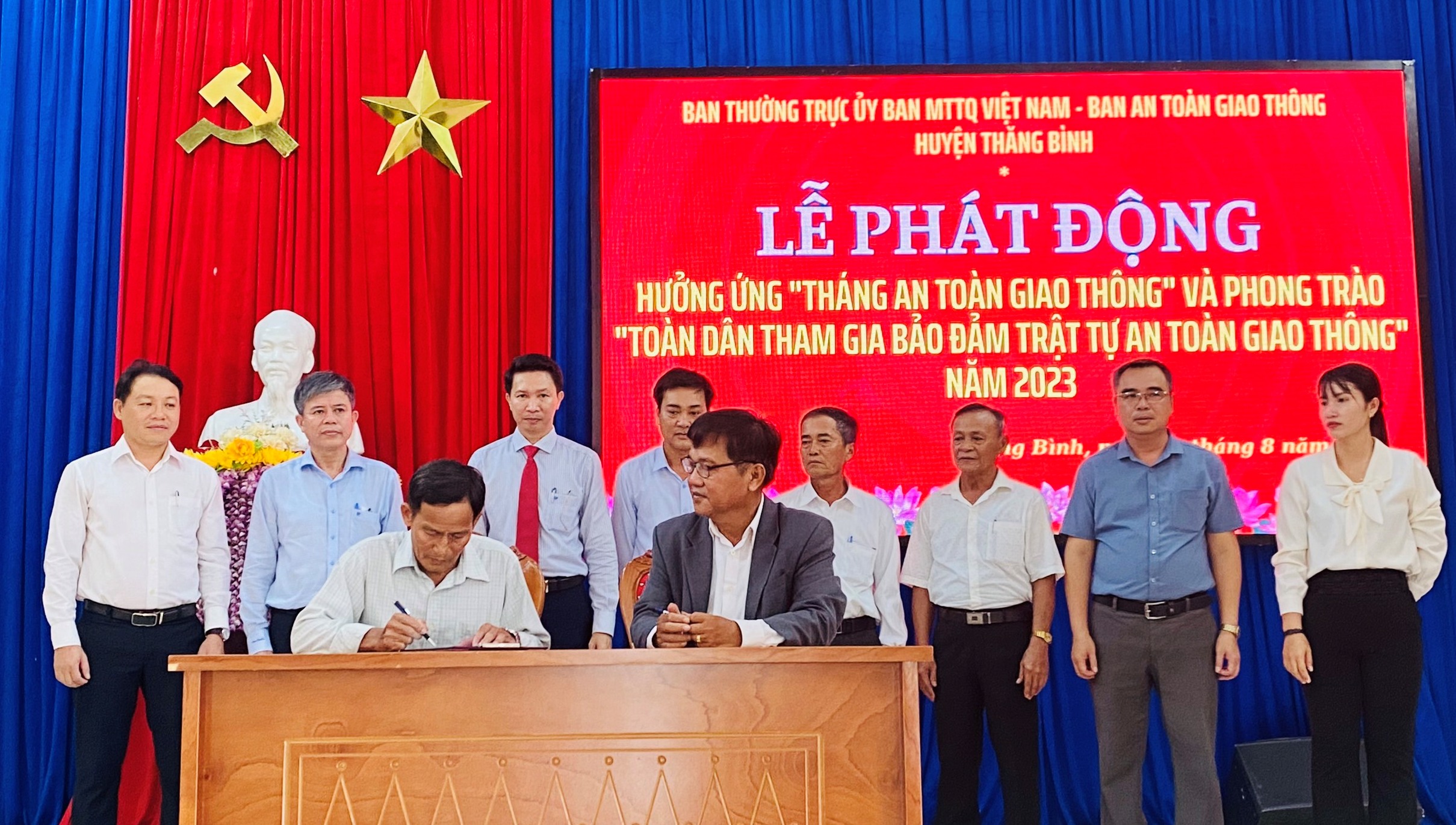 Tại buổi lễ, ông Nguyễn Thanh Phong – UVBTV Huyện ủy, Chủ tịch Ủy ban MTTQ Việt Nam huyện đã thông qua diễn văn phát động “Tháng An toàn giao thông” - Tháng 9 năm 2023 và phong trào “Toàn dân tham gia bảo đảm trật tự an toàn giao thông” với chủ đề “Thượng tôn pháp luật để xây dựng văn hóa giao thông an toàn”; khẳng định việc nâng cao ý thức chấp hành pháp luật của người dân khi tham gia giao thông có ý nghĩa quan trọng, then chốt, góp phần xây dựng văn hóa tham gia giao thông an toàn, thân thiện, ngăn chặn, hạn chế và làm giảm thiểu tình trạng vi phạm pháp luật về trật tự ATGT, tai nạn giao thông, đặc biệt trong dịp cao điểm nghỉ lễ Quốc khánh (02/9), ngày tựu trường. Bên cạnh đó, đề nghị các cấp, các ngành toàn huyện quan tâm triển khai thực hiện tốt một số nhiệm vụ trọng tâm, chú trọng công tác lãnh đạo, chỉ đạo thực hiện các chủ trương, đường lối của Đảng, chính sách pháp luật của Nhà nước về ATGT, tăng cường công tác thanh tra, kiểm tra, xử lý nghiêm các hành vi vi phạm pháp luật về trật tự ATGT, đẩy mạnh công tác thông tin, tuyên truyền nhằm nâng cao nhận thức, ý thức chấp hành pháp luật ATGT của các tầng lớp nhân dân…