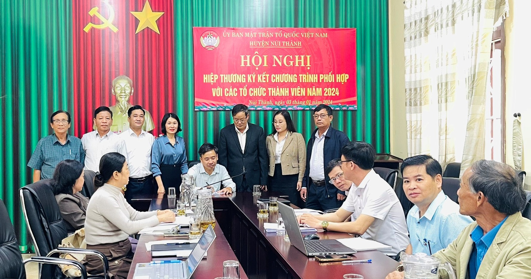 Chủ tịch Ủy ban MTTQ Việt Nam huyện Nguyễn Quốc Vũ đề nghị trong năm 2024 cần đẩy mạnh công tác truyền thông với phương châm cổ vũ lòng yêu nước và tinh thần đại đoàn kết, phát huy sự sáng tạo của Nhân dân trong xây dựng nông thôn mới, đô thị văn minh. Cùng với đó, tiếp tục thực hiện tốt hơn chức năng giám sát, phản biện xã hội, tham gia xây dựng Đảng, xây dựng chính quyền; thực hiện tốt công tác đối ngoại Nhân dân,... Ông nhấn mạnh “Việc ký kết chương trình phối hợp năm 2024 sẽ là tiền đề quan trọng, cũng là cơ sở để các cơ quan tham gia chương trình phối hợp và hoàn thiện chương trình công tác của tổ chức mình trong năm 2024”.