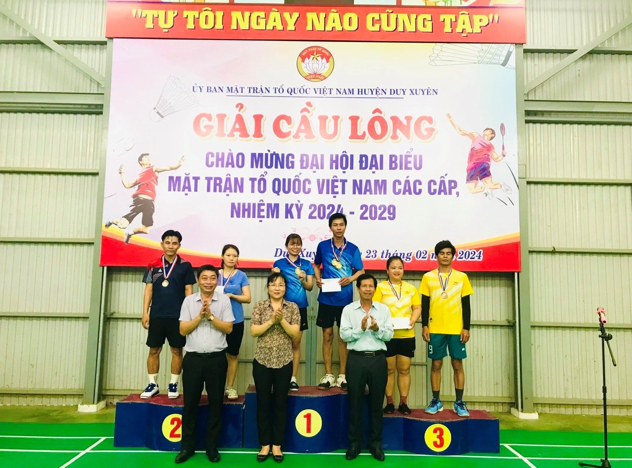 Tổng kết và bế mạc giải, Ban Tổ chức đã trao Huy chương vàng nội dung đơn Nam cho VĐV Đặng Quốc Cường, đơn vị Ủy ban MTTQ Việt Nam xã Duy Phước; Huy chương bạc cho VĐV Nguyễn Văn Năm, đơn vị Ủy ban MTTQ Việt Nam thị trấn Nam Phước; Huy chương đồng cho VĐV Nguyễn Phi Cường, đơn vị Ủy ban MTTQ Việt Nam xã Duy Phú. Ở nội dung đôi Nam - Nữ: Huy chương vàng được trao cho 02 VĐV Đặng Quốc Cường và Lê Thị Mỹ Nga, đơn vị Ủy ban MTTQ Việt Nam xã Duy Phước; Huy chương bạc trao cho 02 VĐV Nguyễn Văn Mạnh và Lê Thị Tạo, đơn vị Ủy ban MTTQ Việt Nam xã Duy Vinh; Huy chương đồng trao cho 02 VĐV Phan Minh Chung và Trần Thị Tư, đơn vị Ủy ban MTTQ Việt Nam xã Duy Thành.