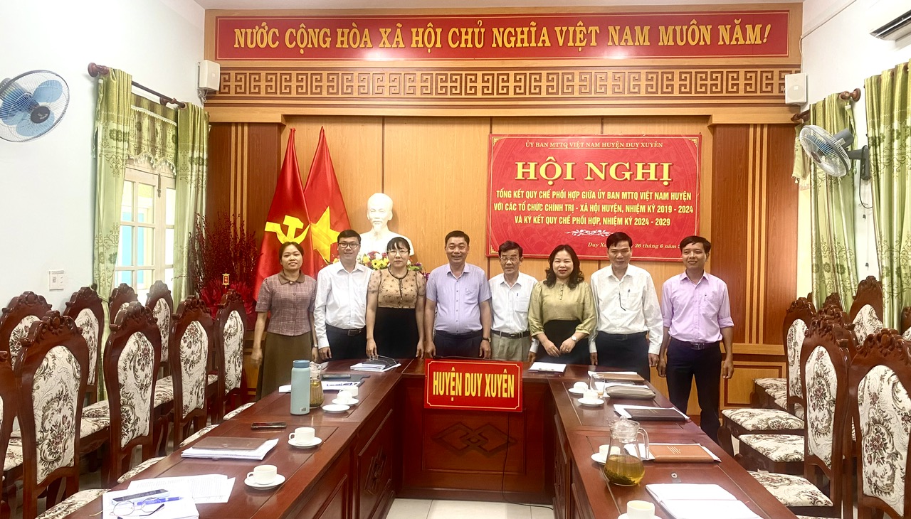 Sáng ngày 26/6/2024, Ủy ban MTTQ Việt Nam huyện Duy Xuyên tổ chức hội nghị đánh giá quy chế phối hợp giữa Ủy ban MTTQ Việt Nam huyện với các tổ chức chính trị - xã hội huyện, nhiệm kỳ 2019 - 2024 và ký kết Quy chế phối hợp nhiệm kỳ 2024 - 2029. Ông Nguyễn Thanh Hải - UVBTV Huyện ủy, Chủ tịch Ủy ban MTTQ Việt Nam huyện chủ trì hội nghị. Tham dự hội nghị có Ban Thường trực Ủy ban MTTQ Việt Nam huyện, lãnh đạo các tổ chức chính trị - xã hội huyện.
