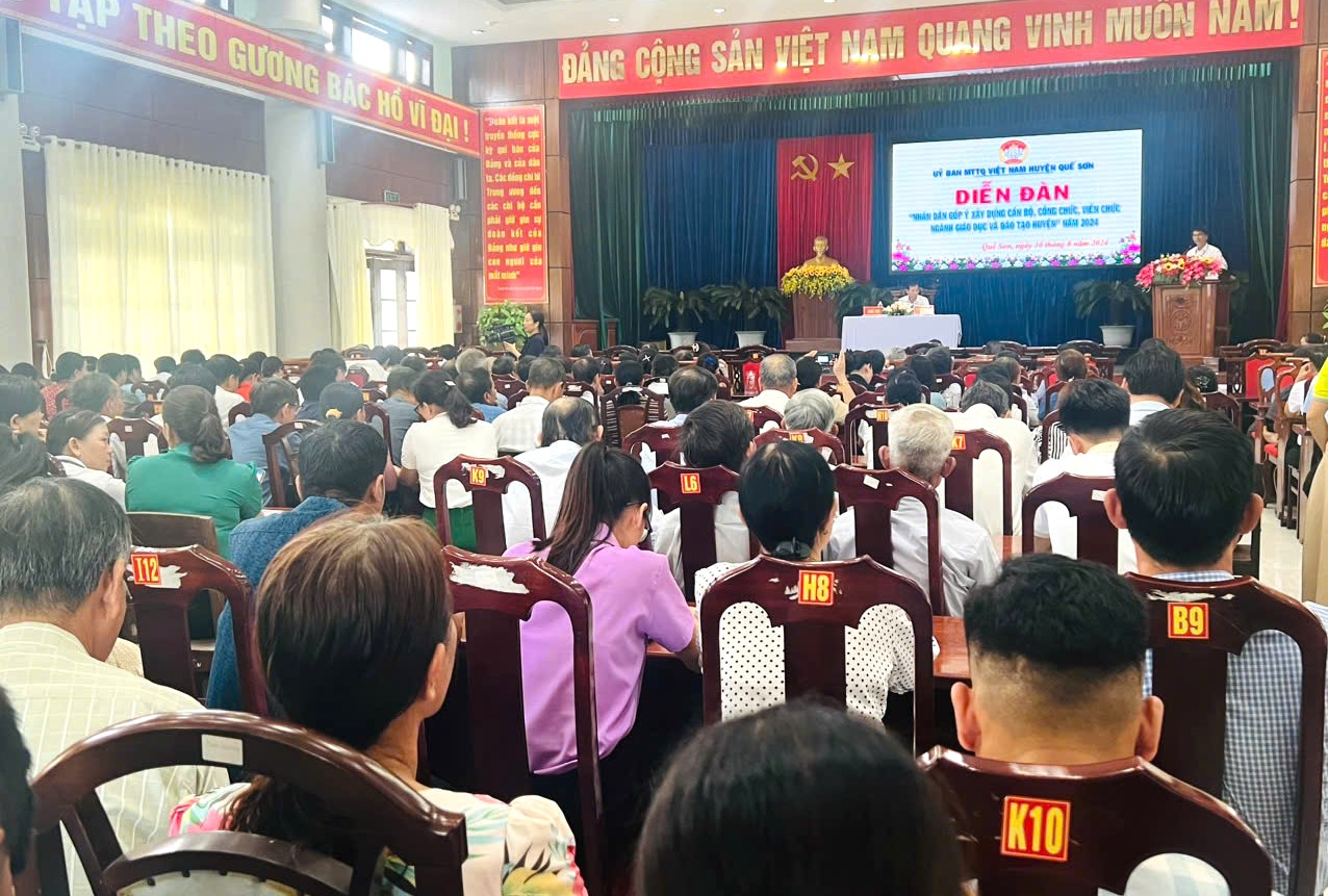 Chiều ngày 30/8/2024, Ban Thường trực Ủy ban MTTQ Việt Nam huyện Quế Sơn tổ chức Diễn đàn “Nhân dân góp ý cán bộ, công chức, viên chức ngành giáo dục và đào tạo huyện” năm 2024. Tham dự Diễn đàn có ông Nguyễn Văn Thắng - UVBTV Huyện ủy, Phó Chủ tịch UBND huyện; lãnh đạo Phòng Giáo dục và Đào tạo huyện, lãnh đạo các trường THPT, THCS, Tiểu học, Mẫu giáo trên địa bàn huyện Quế Sơn; Trưởng thôn, Trưởng Ban công tác Mặt trận các khu dân cư và gần 200 đại biểu Nhân dân trên địa bàn toàn huyện. Ông Phạm Đình Bảy - UVBTV Huyện ủy, Chủ tịch Ủy ban MTTQ Việt Nam huyện, Chủ trì buổi diễn đàn.