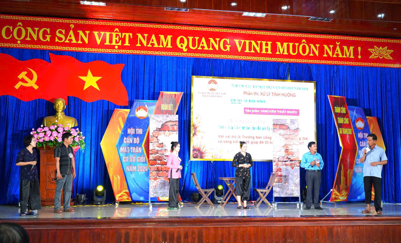 Có 20 đội tham gia Hội thi với 56 vị trưởng ban công tác Mặt trận, 04 chi hội trưởng nông dân, phụ nữ thôn, khối phố và 124 lực lượng phụ họa là thành viên Ban công tác Mặt trận ở các KDC. Các Đội thi đã trải qua 03 phần thi gồm: Phần thi “Tự giới thiệu”, phần thi “Nghiệp vụ công tác Mặt trận” và phần thi “Xử lý tình huống”. Trong đó, có 01 phần thi bằng hình thức trắc nghiệm và 02 phần thi được thể hiện bằng hình thức sân khấu hóa. Các thí sinh đã cùng nhau tranh tài trong không khí sôi động, với sự cổ vũ nhiệt tình từ các cổ động viên.
