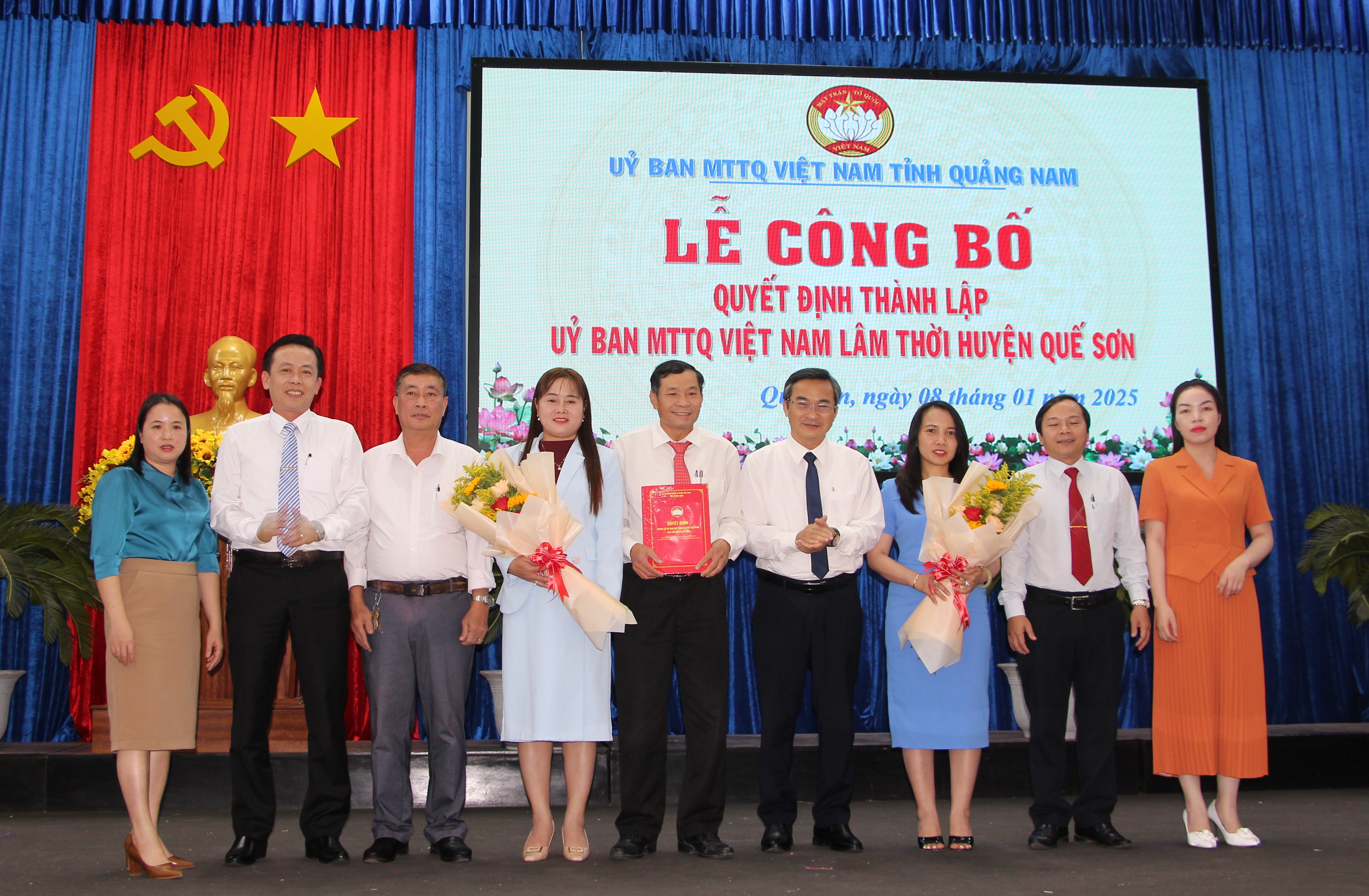 Căn cứ Quyết định số 1704-QĐ/TU, ngày 04/12/2024 của Ban Thường vụ Tỉnh ủy Quảng Nam về việc thành lập Đảng bộ huyện Quế Sơn trực thuộc Đảng bộ tỉnh; Chủ tịch Ủy ban MTTQ Việt Nam tỉnh Lê Trí Thanh vừa ký quyết định thành lập Ủy ban Mặt trận Tổ quốc Việt Nam lâm thời huyện Quế Sơn.