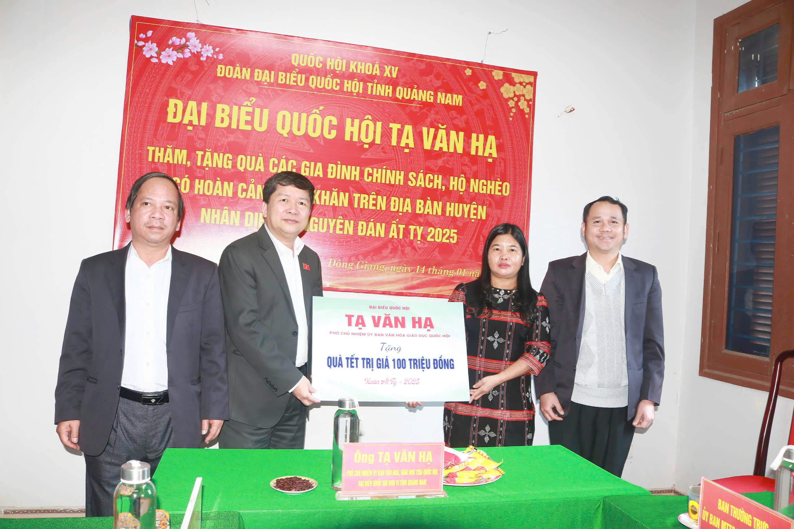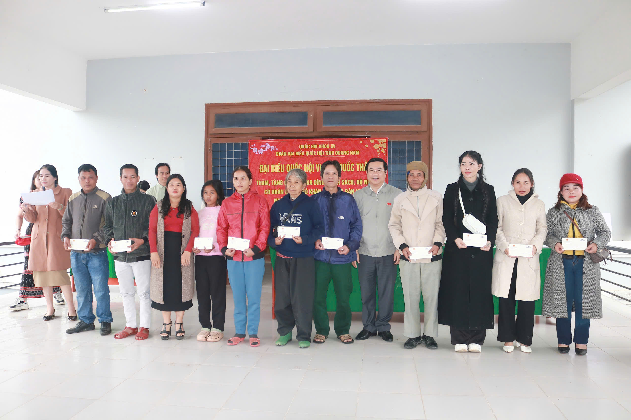 Trước thềm năm mới Tết Nguyên Đán Ất Tỵ năm 2025, đại biểu Quốc hội thuộc Đoàn ĐBQH tỉnh Quảng Nam ông Vương Quốc Thắng - Uỷ viên chuyên trách, Uỷ ban Khoa học, Công nghệ và Môi trường của Quốc hội trao tặng hỗ trợ xây dựng 03 nhà Đại đoàn kết (mỗi căn trị giá 60 triệu đồng) và 65 suất quà, mỗi suất trị giá 700.000 đồng.