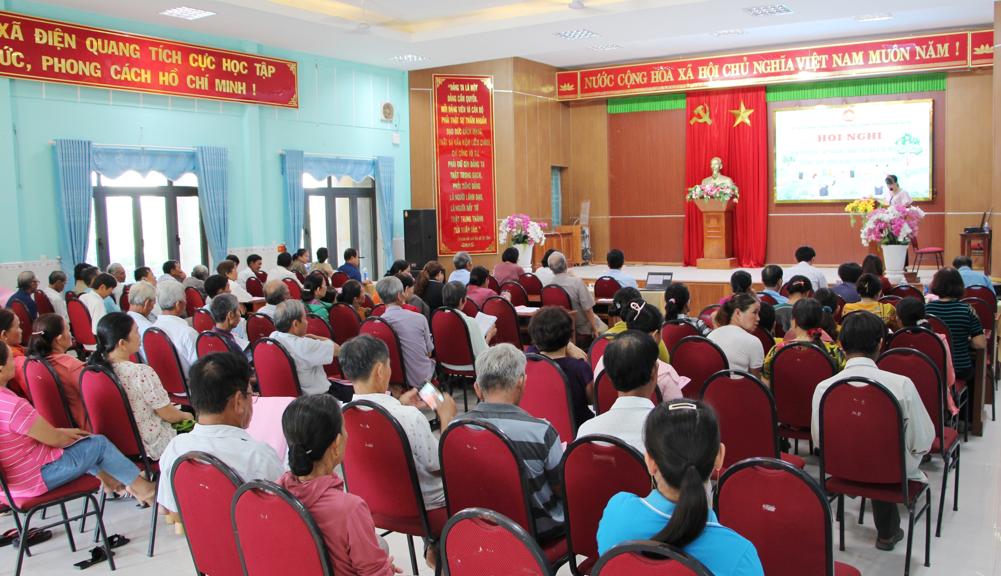 Hội nghị phổ biến nội dung Kết luận 73-KL/TU ngày 20/7/2021 của Tỉnh ủy Quảng Nam về tăng cường công tác quản lý, bảo vệ môi trường và tài nguyên khoáng sản trên đại bàn tỉnh giai đoạn 2021-2025; trao đổi, hướng dẫn người dân cách phân loại rác thải tại nguồn và trả lời phiếu khảo sát đánh giá sự hài lòng của người dân đối với chất lượng môi trường sống tại địa phương.