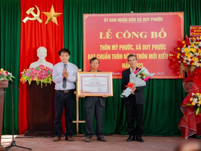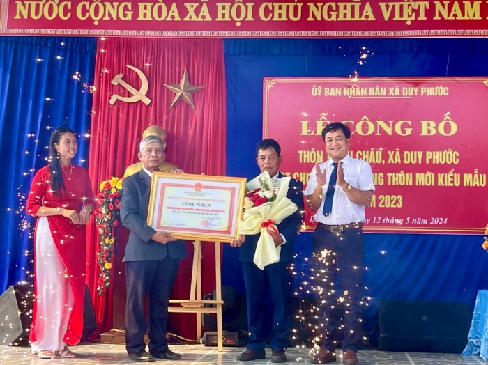 Tại buổi lễ, đại điện UBND huyện và Văn phòng Điều phối nông thôn mới huyện Duy Xuyên đã trao bằng công nhận thôn nông thôn mới kiểu mẫu năm 2023 cho 2 thôn Triều Châu và Mỹ Phước. Dịp này, UBND xã Duy Phước cũng tặng giấy khen cho các tập thể cá nhân có thành tích xuất sắc trong xây dựng nôn thôn mới kiểu mẫu tại địa phương./.