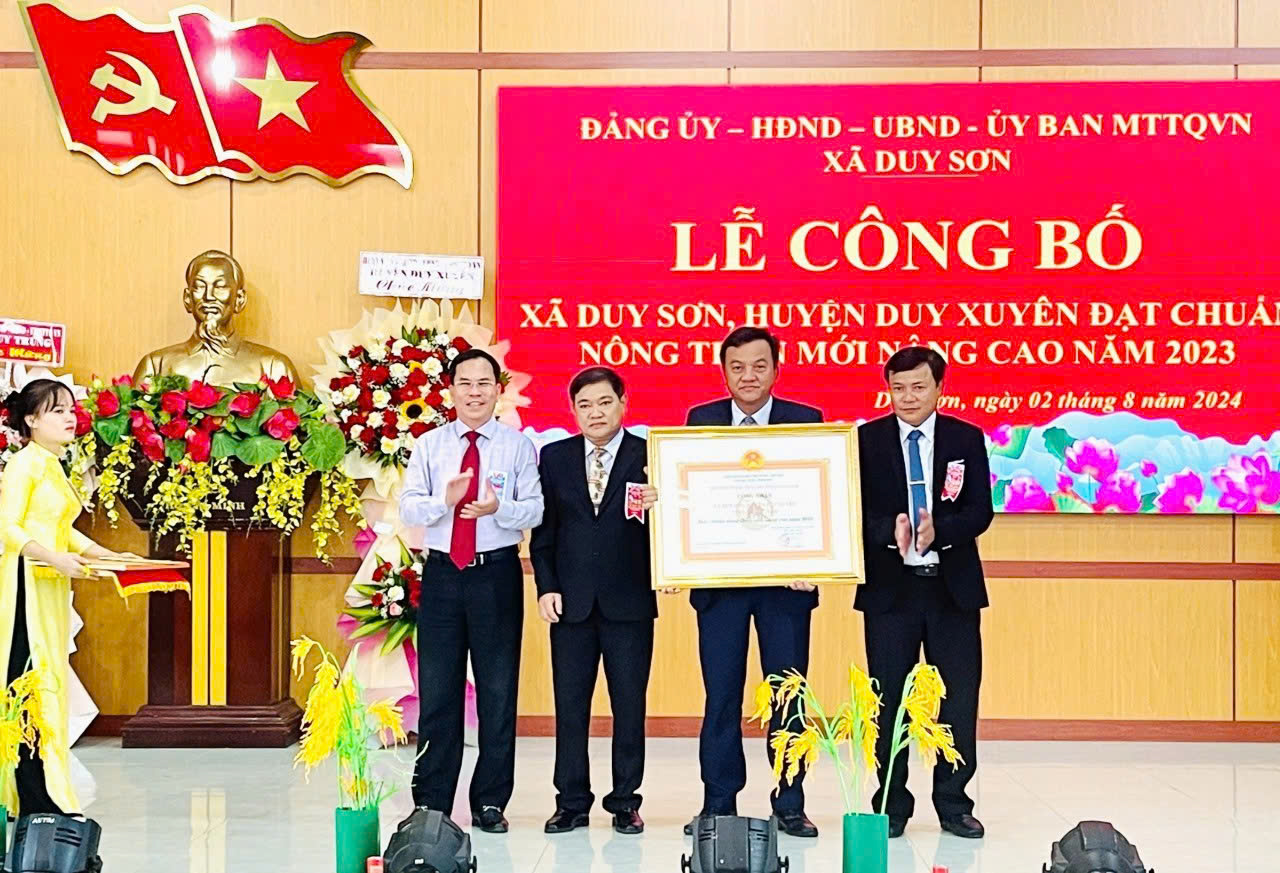Tại buổi Lễ, thừa ủy quyền của UBND tỉnh, lãnh đạo Sở Văn hóa - Thể thao và Du lịch trao bằng công nhận đạt chuẩn xã NTM nâng cao năm 2023 cho lãnh đạo xã Duy Sơn.