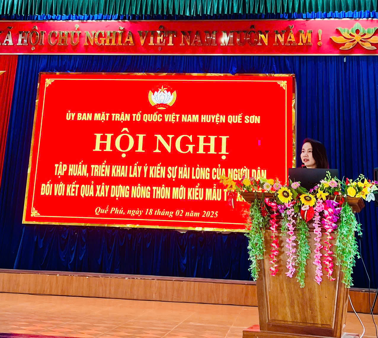 Tại hội nghị, đại diện Ban Chỉ đạo xây dựng nông thôn mới xã đã trình bày báo cáo kết quả xây dựng nông thôn mới và nông thôn mới kiểu mẫu năm 2024 tại địa phương. Đồng thời, đại diện lãnh đạo Ủy ban MTTQ Việt Nam huyện Quế Sơn đã triển khai kế hoạch lấy ý kiến sự hài lòng của người dân về kết quả xây dựng xã nông thôn mới đối với xã Quế Thuận và nông thôn mới kiểu mẫu đối với xã Quế Phú với các nội dung và quy trình cụ thể như công tác thông tin tuyên truyền, hình thức và nội dung lấy ý kiến, thời điểm và thời gian thực hiện, quy trình các bước tiến hành, công khai kết quả, cùng với công tác quản lý và lưu giữ phiếu lấy ý kiến. Hội nghị cũng đã giải đáp các vướng mắc trong quá trình triển khai lấy ý kiến tại khu dân cư.