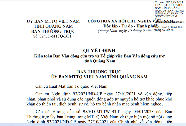 Ban Thường trực Ủy ban MTTQ Việt Nam tỉnh Quảng Nam có trách nhiệm ban hành Quy chế tổ chức và hoạt động cho Ban Vận động cứu trợ nhằm đảm bảo tính hiệu quả và minh bạch trong công tác vận động cứu trợ, phân phối hỗ trợ cho những người dân gặp khó khăn do thiên tai, dịch bệnh hoặc mắc bệnh hiểm nghèo.