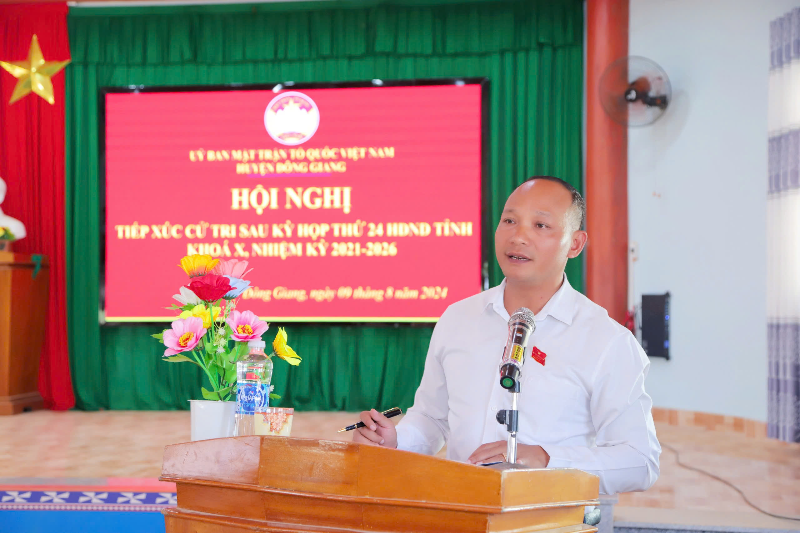 * Cử tri huyện Đông Giang: Đề nghị HĐND tỉnh sớm cấp nguồn kinh phí hỗ trợ khắc phục bảo lụt năm 2023; quan tâm sớm cấp nguồn kinh phí quản lý, bảo trì hệ thống đường bộ trên địa bàn huyện; nên có cơ chế trong việc quản lý, bảo vệ và khai thác tài nguyên khoáng sản (cát, rừng, vàng) đối với các huyện miền núi; đề nghị UBND tỉnh quan tâm hỗ trợ thêm nguồn kinh phí để UBND huyện thực hiện hoàn thành xây dựng dự án theo Quyết định số 4190/QĐ-UBND ngày 24/12/2019 của UBND tỉnh Quảng Nam về việc giao nhiệm vụ triển khai thực hiện các dự án phát triển kết cấu hạ tầng giao thông gắn với phát triển vùng nguyên liệu trên địa bàn các huyện miền núi; đề nghị tỉnh kiến nghị lên Bộ Giao thông vận tải quan tâm sớm đầu tư, nâng cấp hoàn chỉnh Quốc lộ 14G, đồng thời có giải pháp quản lý hành lang đường bộ trên tuyến Quốc lộ này.
