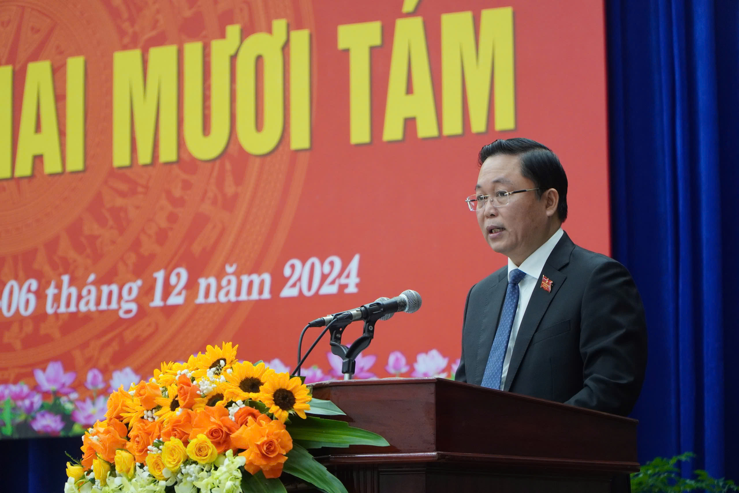 Ông Lê Trí Thanh - UV BTV Tỉnh ủy, Chủ tịch Ủy ban MTTQ Việt Nam tỉnh phát biểu tại kỳ họp thứ 28.