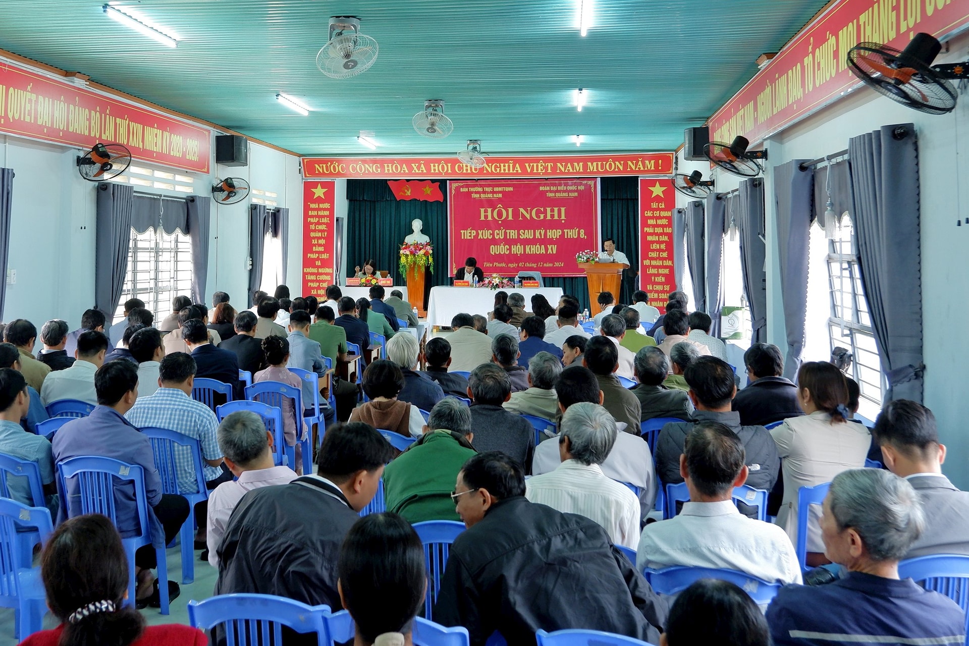 Tại các buổi tiếp xúc, Đoàn đại biểu Quốc hội tỉnh Quảng Nam đã thông tin với cử tri về kết quả kỳ họp thứ 8, Quốc hội khóa XV. Cử tri và Nhân dân tại các địa phương bày tỏ phấn khởi trước những thành tựu của đất nước thời gian qua, nhất là việc tinh giản biên chế, việc đẩy mạnh sắp xếp tổ chức bộ máy của hệ thống chính trị, công tác phòng, chống tham nhũng, xử lý nghiêm các đối tượng vi phạm; công khai thông tin, tiến độ xử lý các vụ án tham nhũng kịp thời...