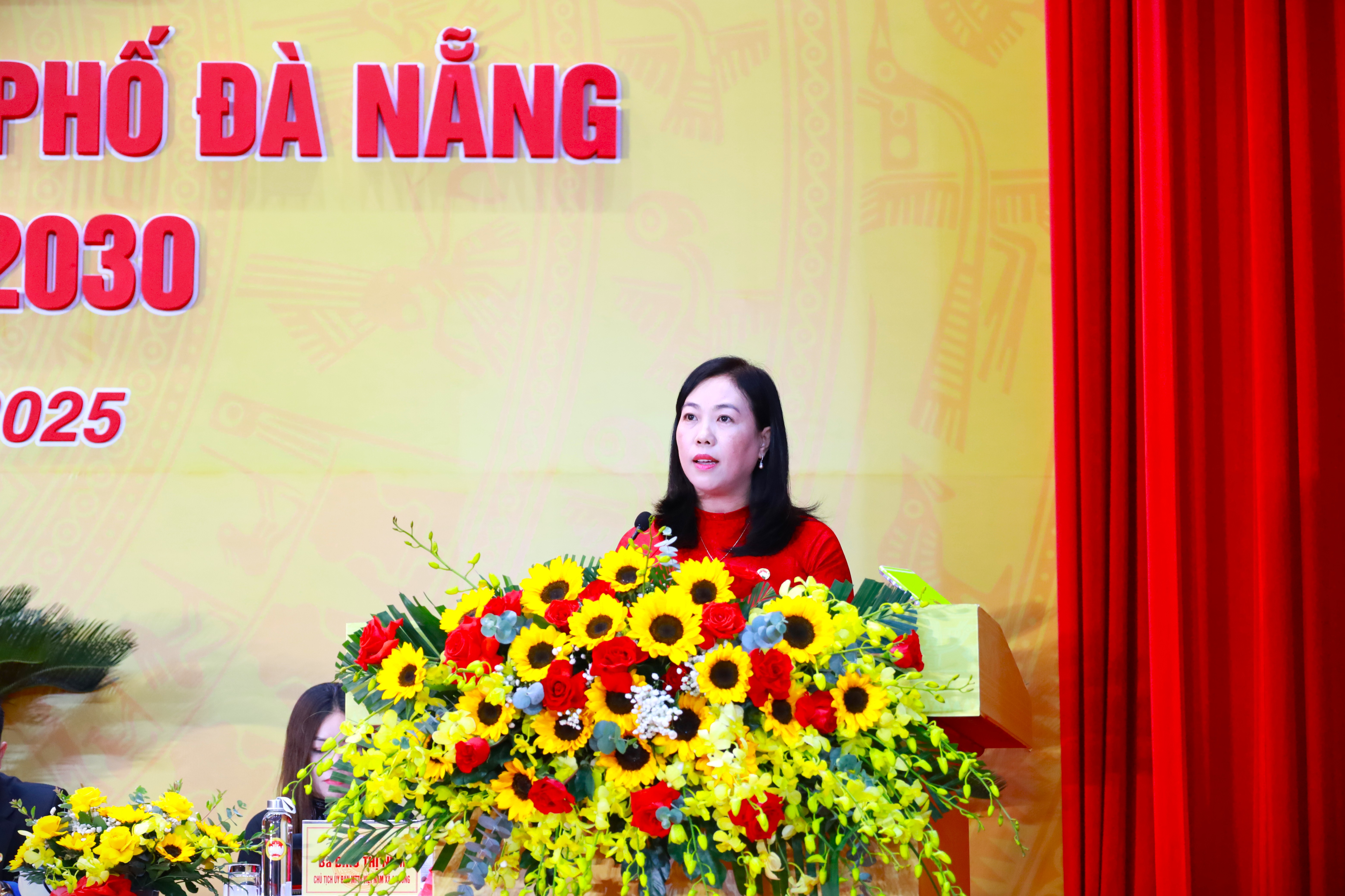 Phó Chủ tịch Ủy ban MTTQ Việt Nam thành phố nhiệm kỳ 2024-2029 Trần Thị Mẫn trình bày báo cáo kiểm điểm hoạt động của Ủy ban MTTQ Việt Nam thành phố, nhiệm kỳ 2024 - 2029.