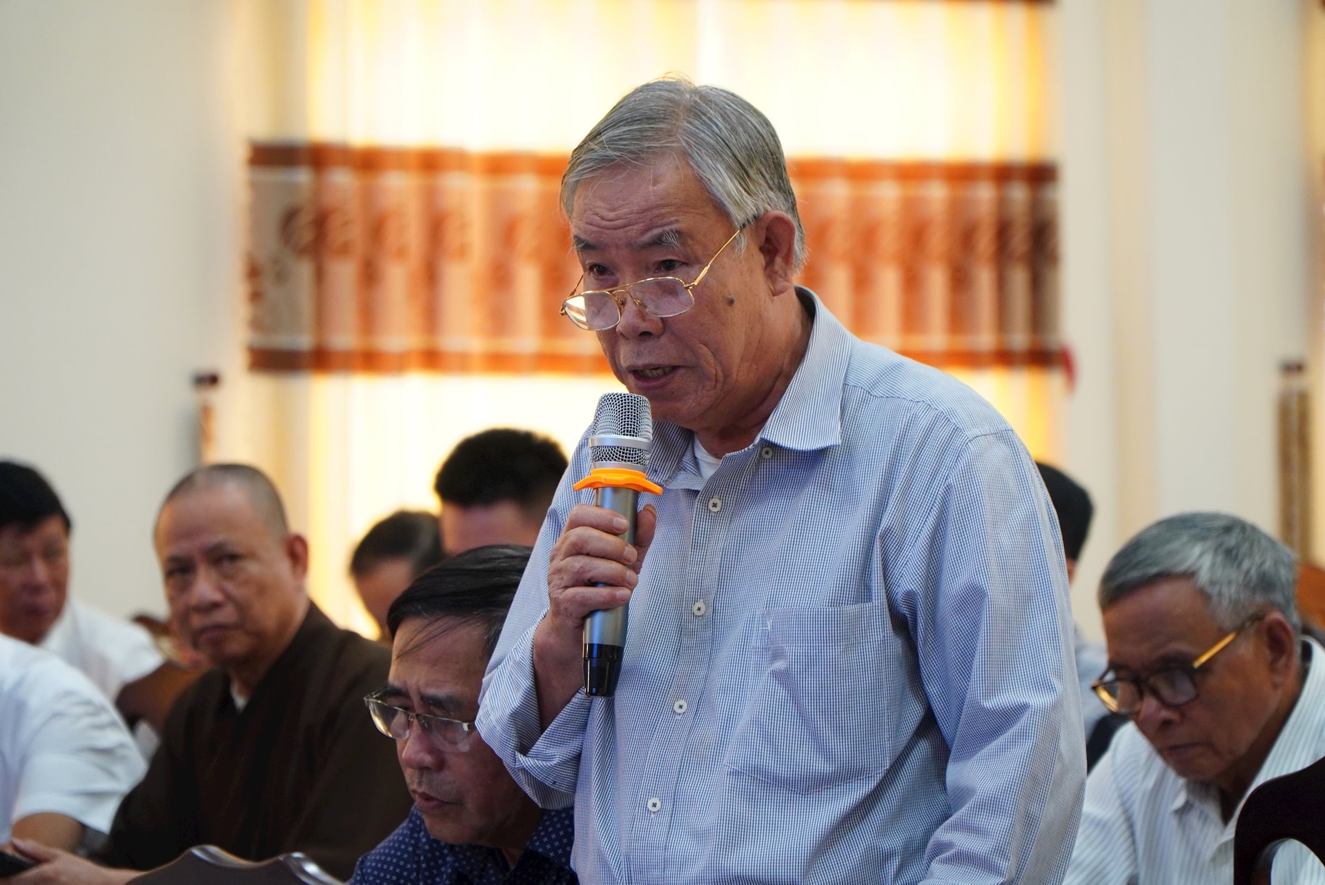 Ông Lê Sáu - nguyên Phó Giám đốc Sở LĐTB&XH, Ủy viên Ủy ban MTTQ Việt Nam tỉnh, Phó Chủ nhiệm HĐTV Kinh tế - xã hội của Ủy ban MTTQ Việt Nam tỉnh nhiệm kỳ 2024 - 2029 phát biểu. Ảnh: TÂM ĐAN